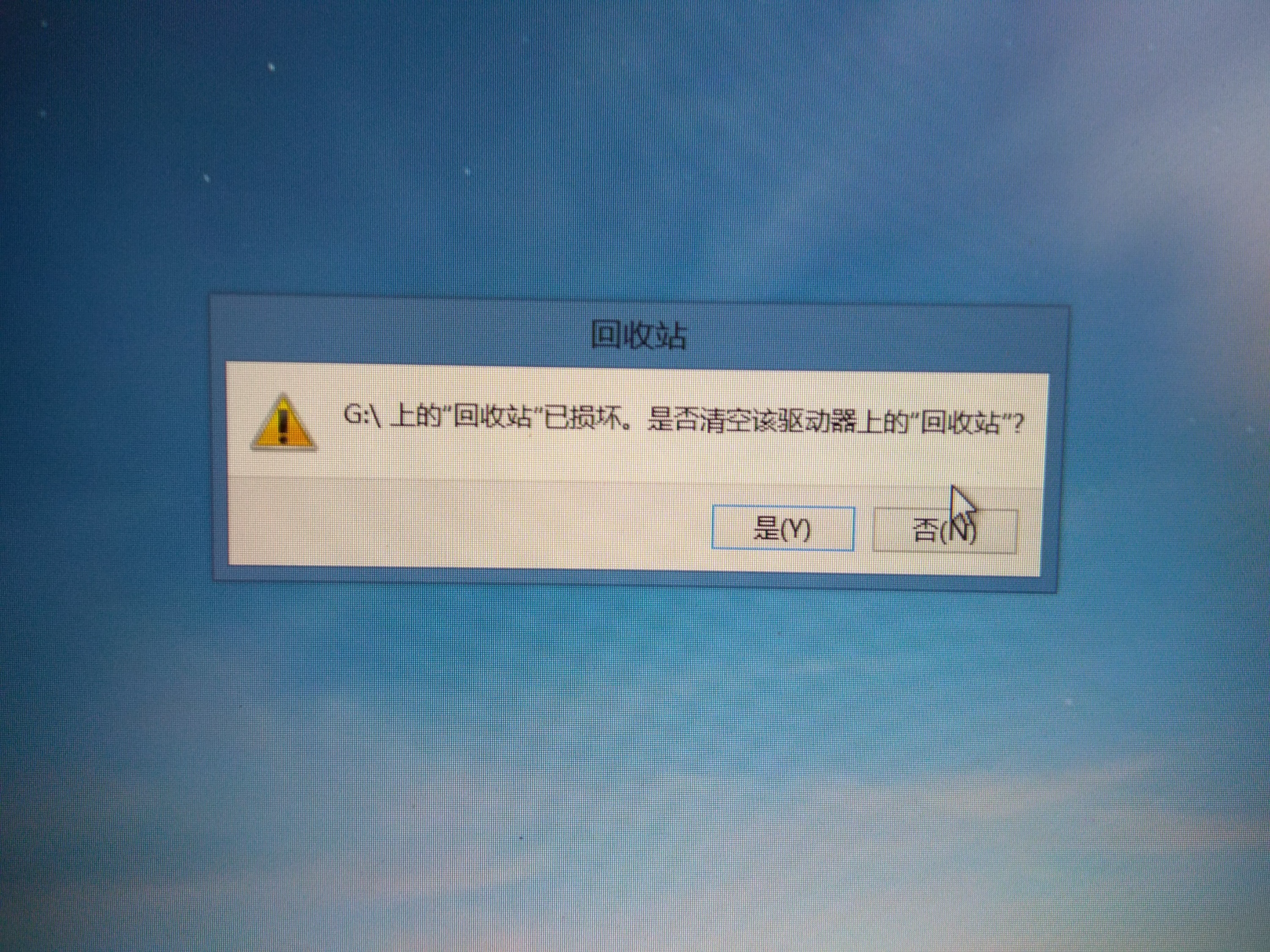 每个盘符都有一个隐藏的回收站文件夹,估计是g盘那个回收站文件损坏了