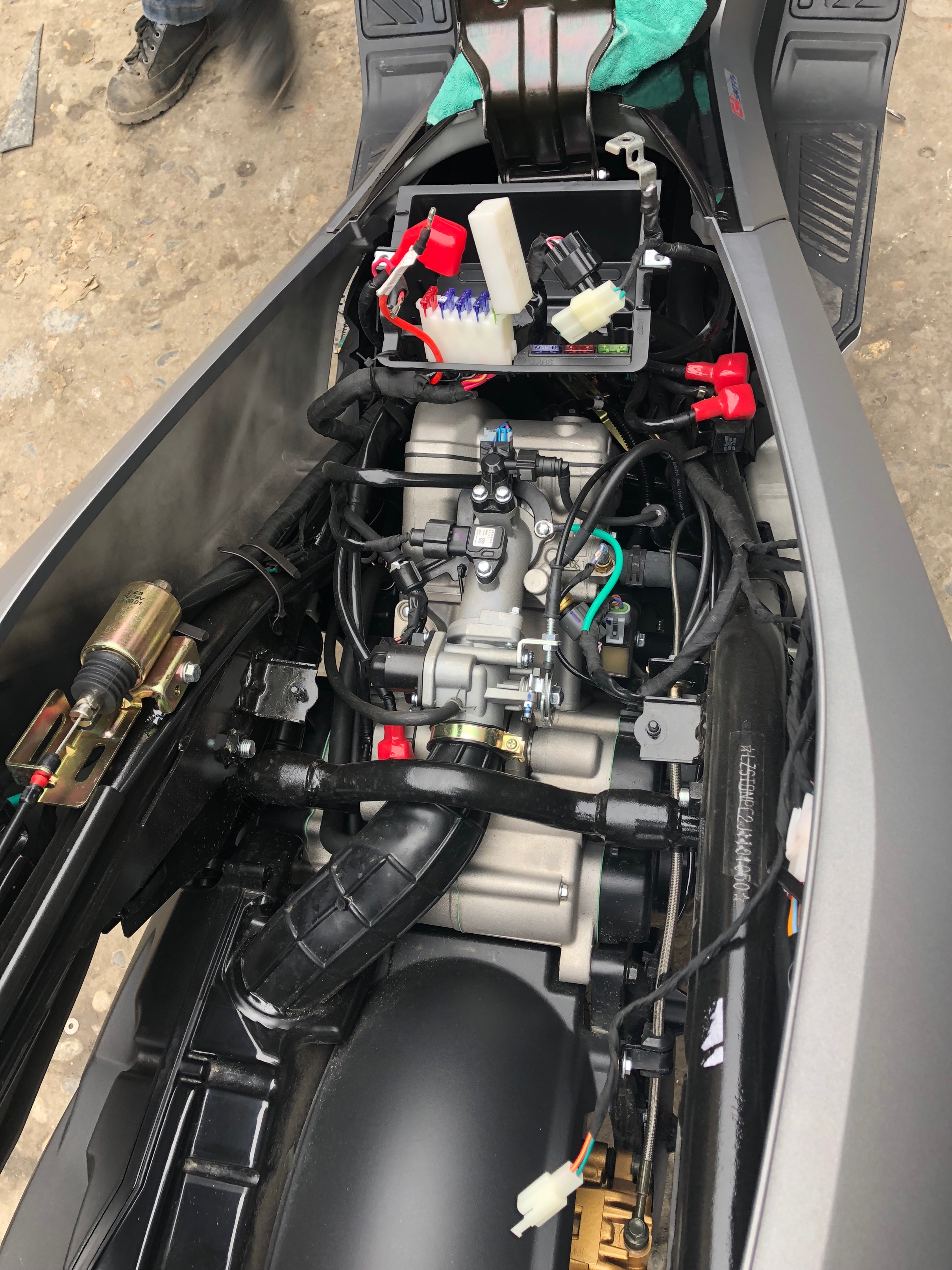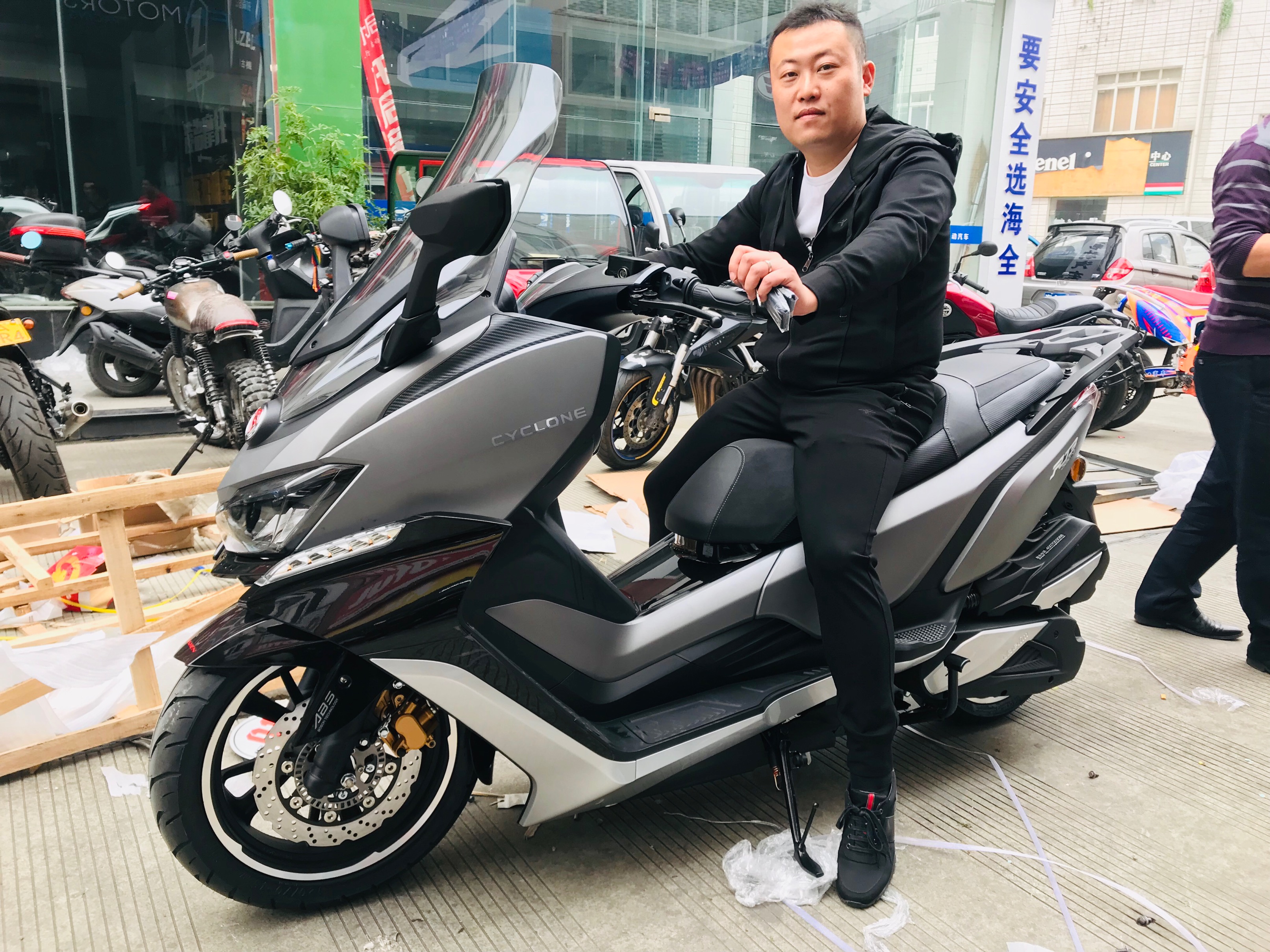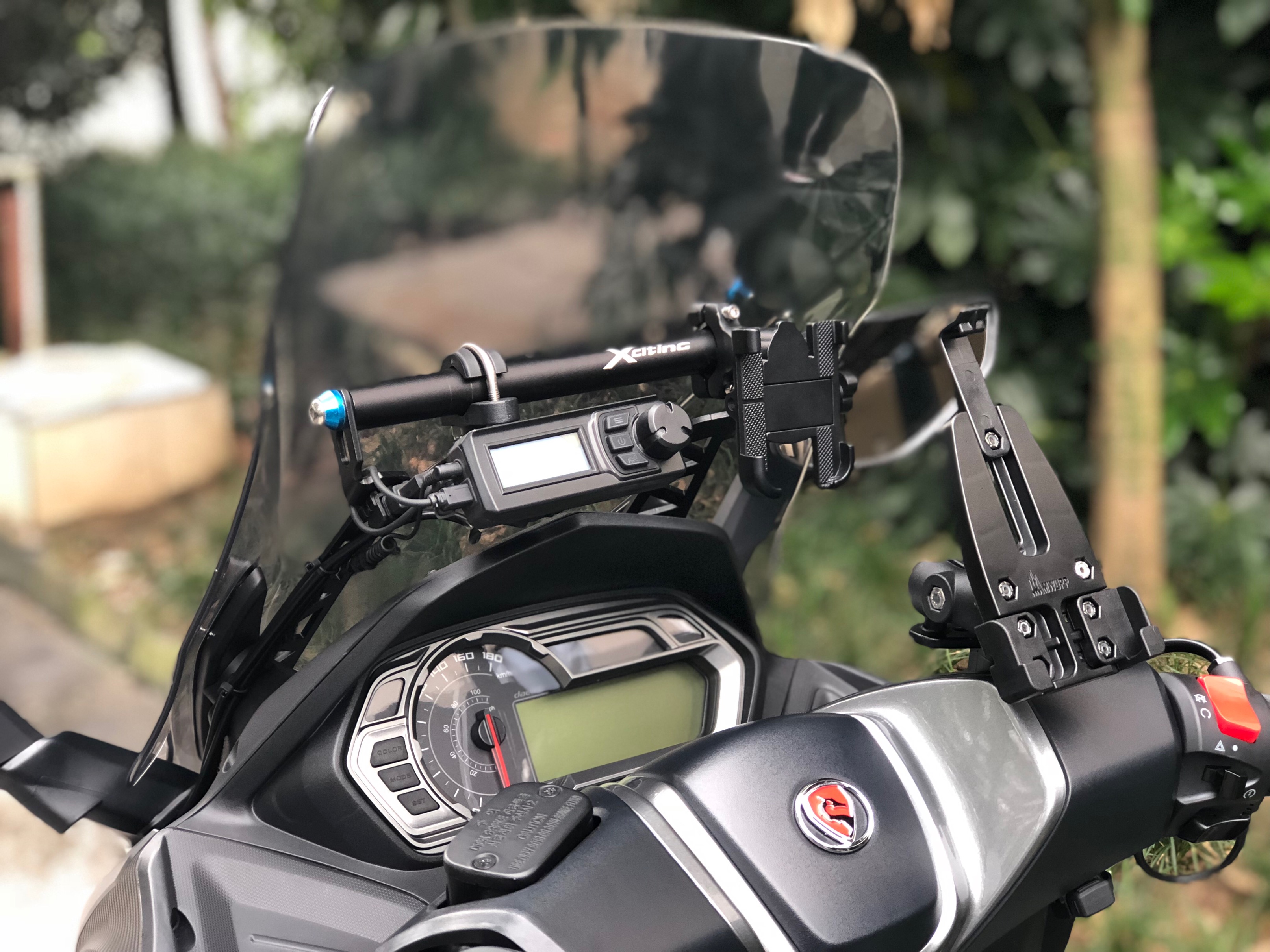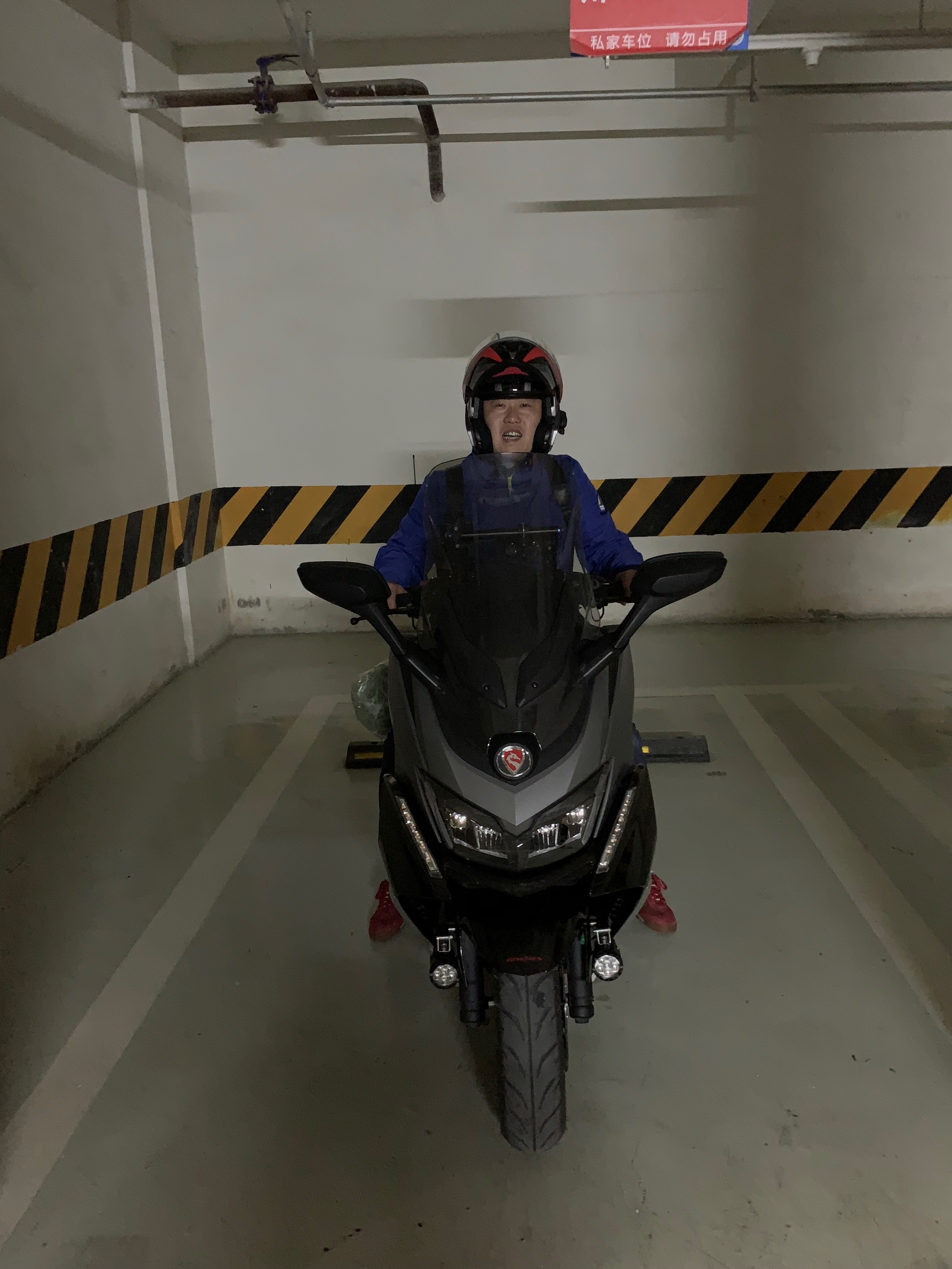 10月6日提车后,10月8日上班第一天在成都犀浦顺利上牌,验车一次通过。然后回到店里安装45升夏德尾箱,后来又加装了日本代购4挡可调电加热手把、甚高频电台、蓝牙适配器、铺路灯、后爆闪,将这辆看上去很漂亮的踏板车武装起来。