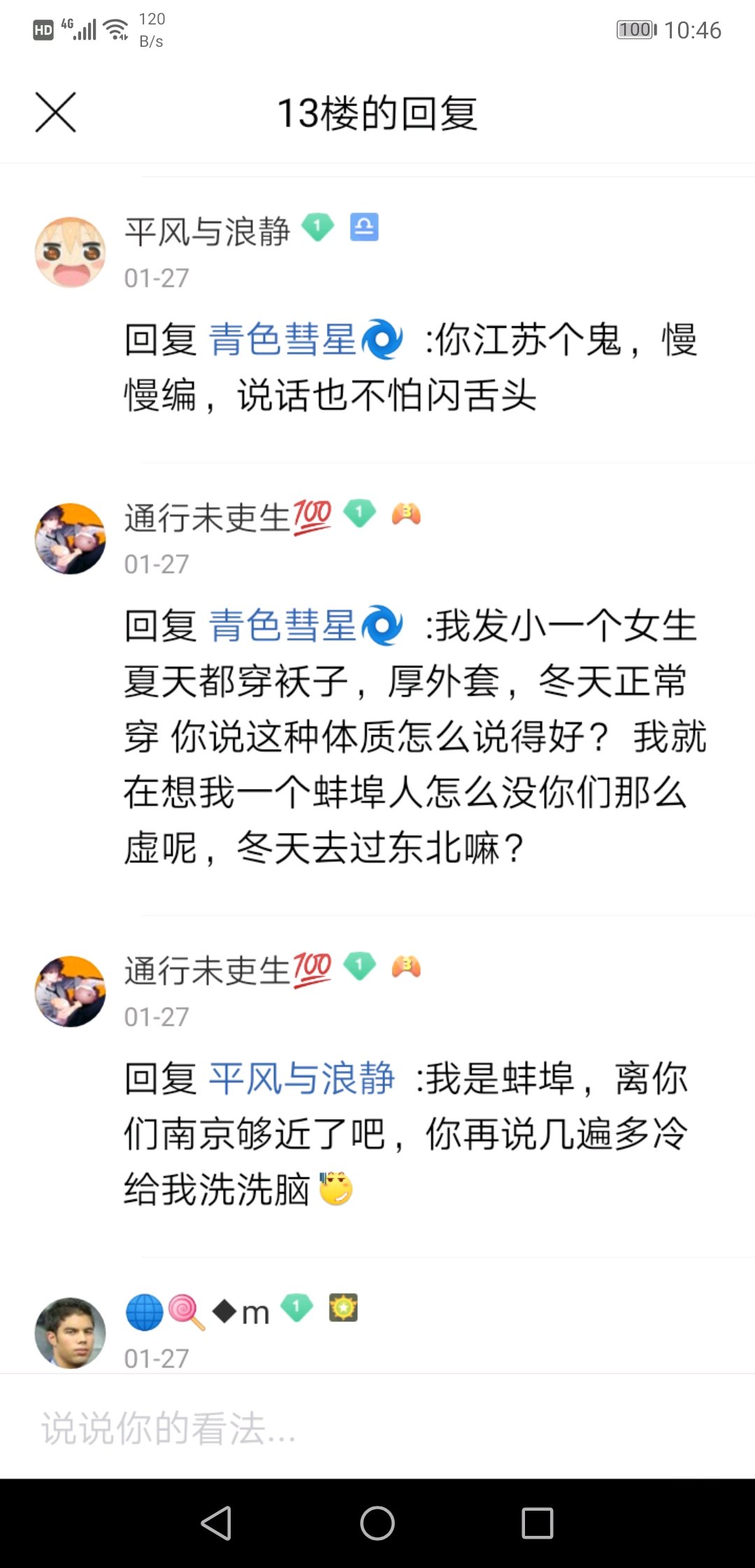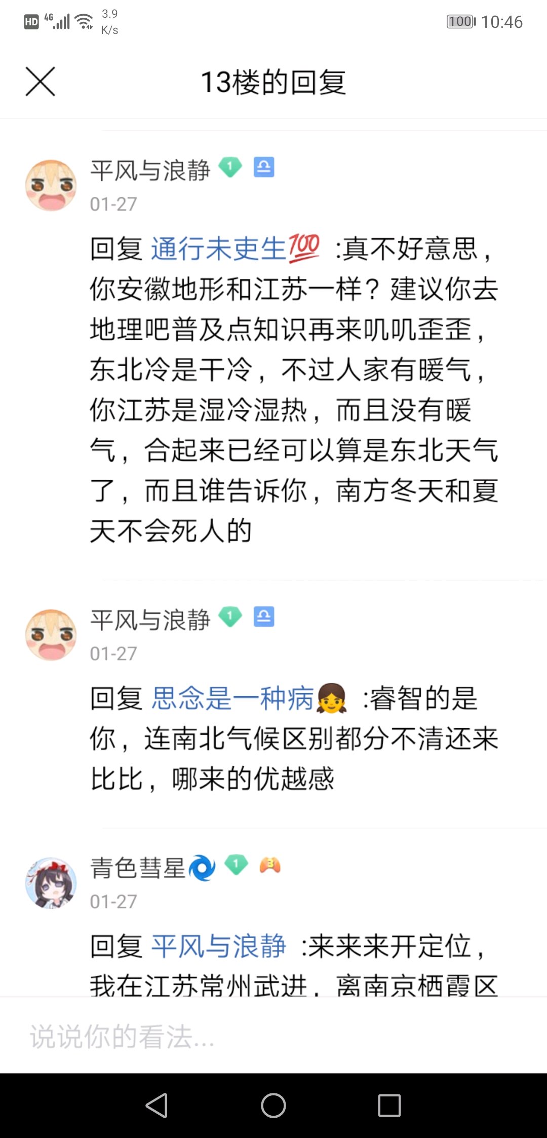 我呢常州人,距离南京140公里。现在还一直去南京,知道南京的冷没那么夸张,就回帖跟它辩论,这货跟我扯地理差,我估摸着南京没有高山,经纬度也跟常州差不多哪来这么多差别