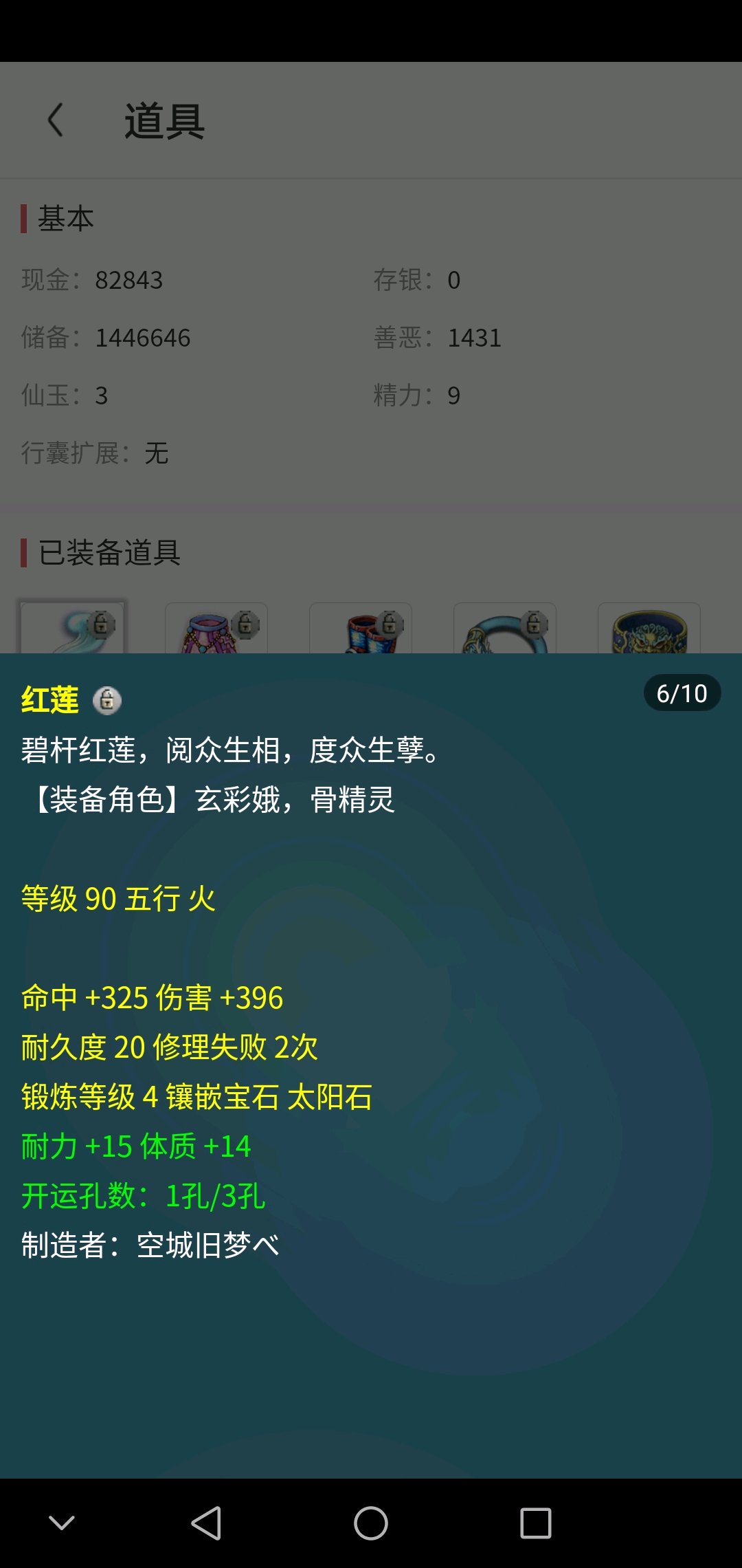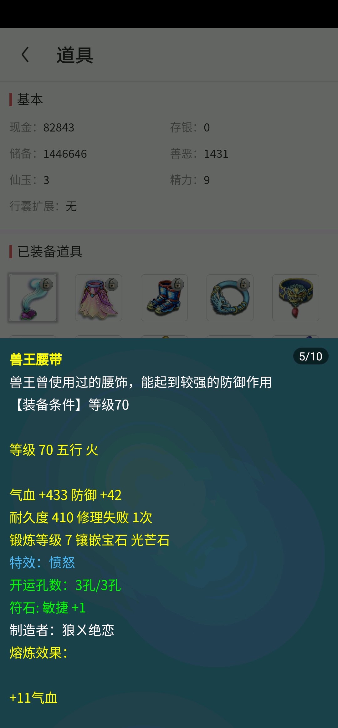 装备有2件4孔,特技带晶清链子、罗汉武器、水清鞋子、愤怒腰带,灵饰