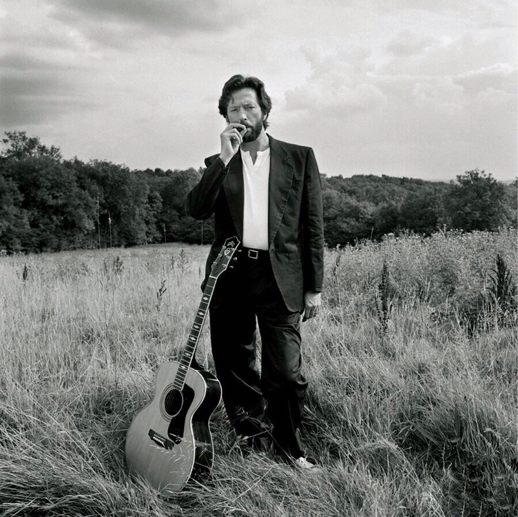 以前看到的现在找不到了,eric年轻时候的,站在草地上,脚边放一把木吉他