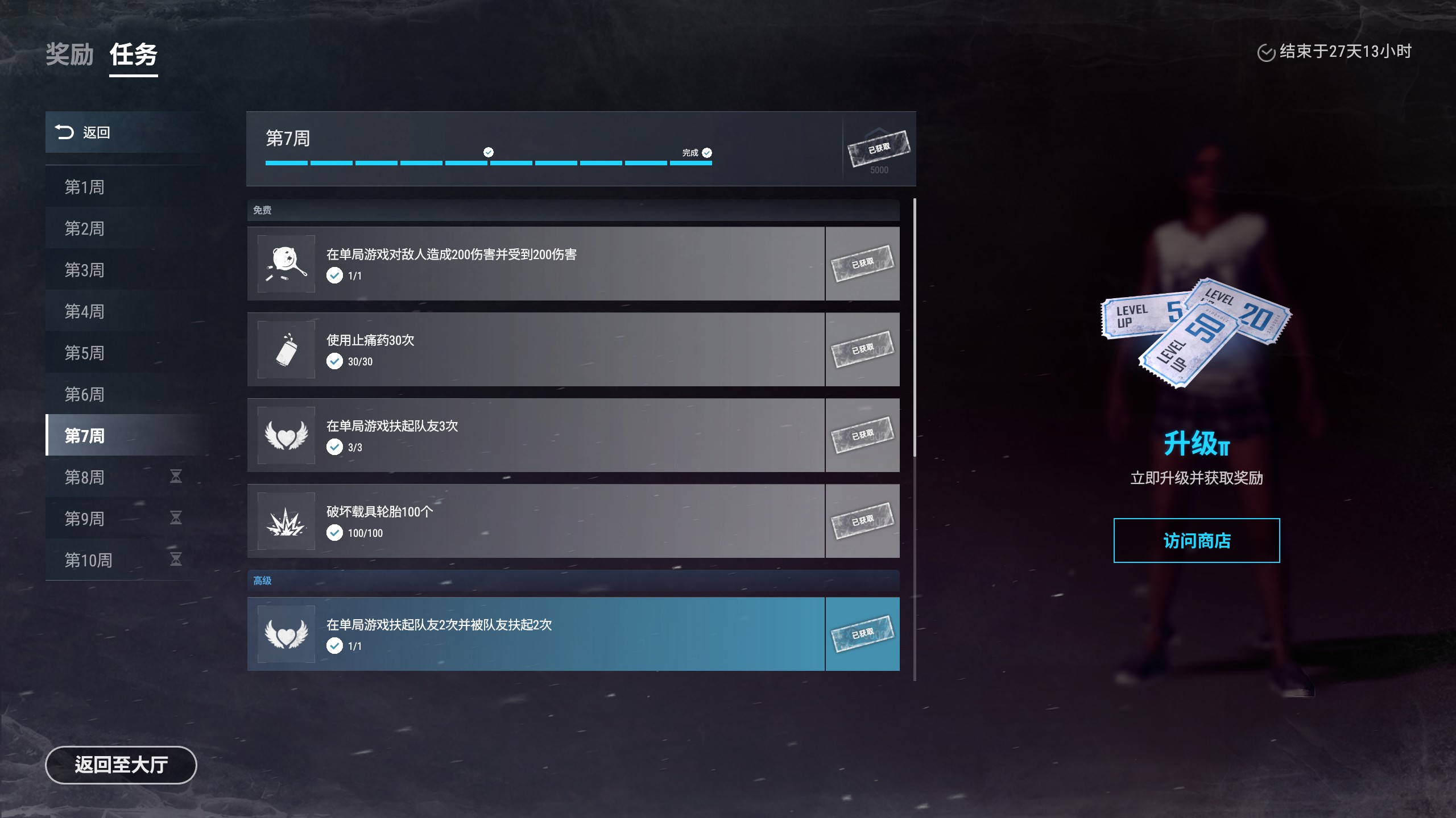 休息会把第七周挑战任务也做了...目前71级了...还有3周多...100级不买通行证也能到..