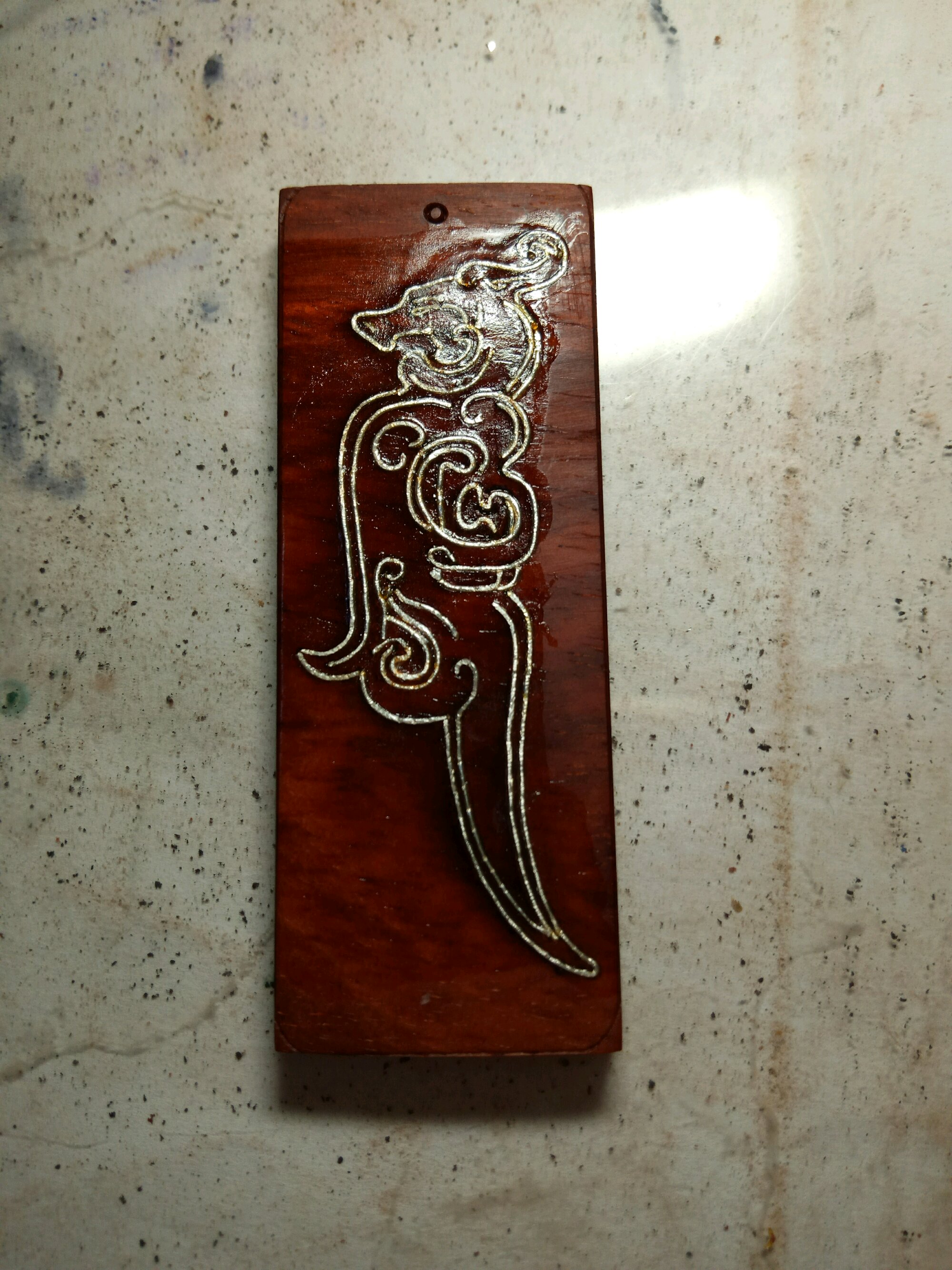 照例先用紫光檀试一下,果然有几个线条离得太近,没法嵌丝(其实是手艺不到家),所以嵌了黄铜粉。因为背后木料有瑕疵,所以阳刻“治烦决乱”四个字,周围麻底,基本上绕过了瑕疵。打磨到5000后习惯性上蜡,就喜欢这样三俗的效果
