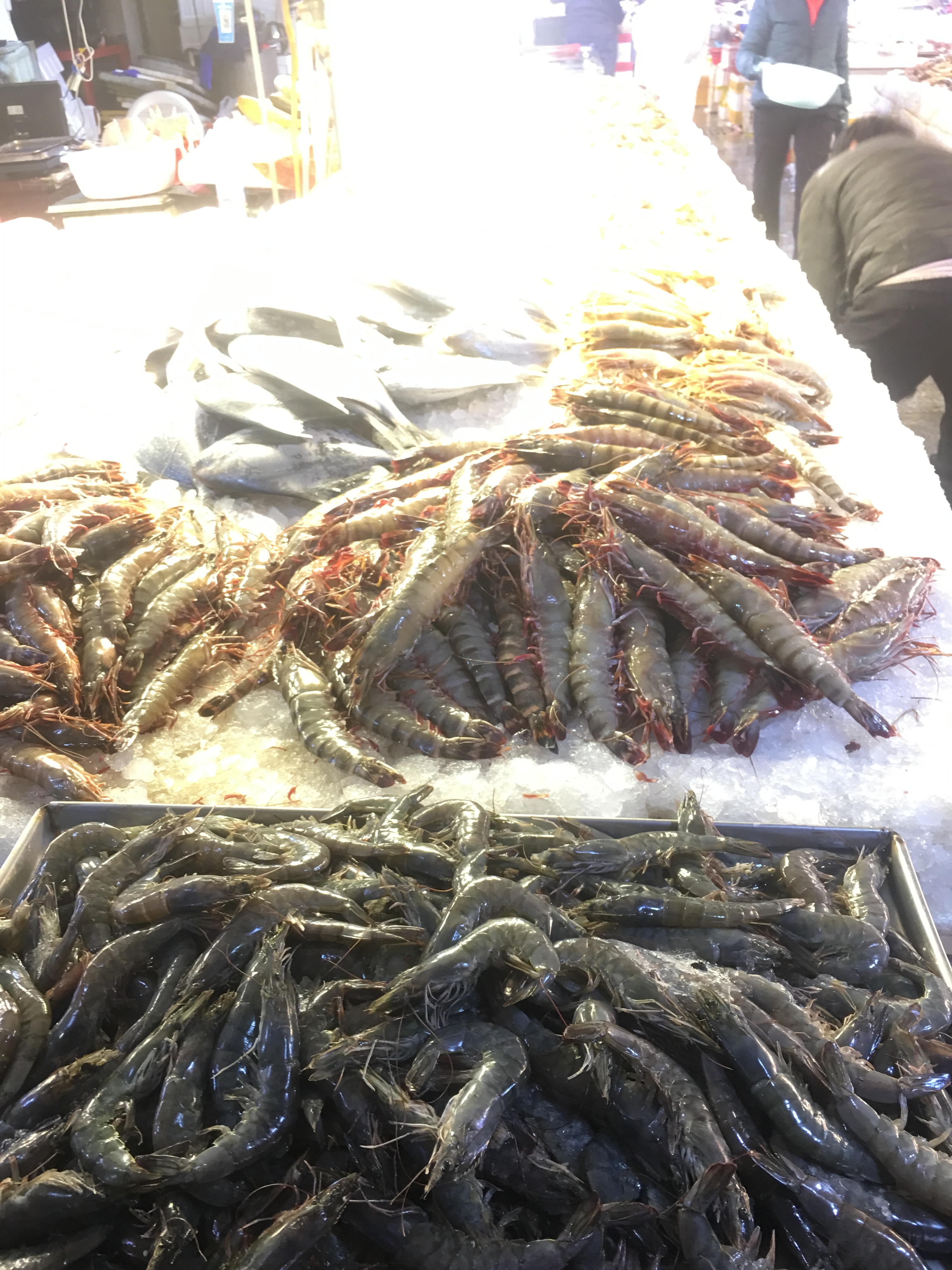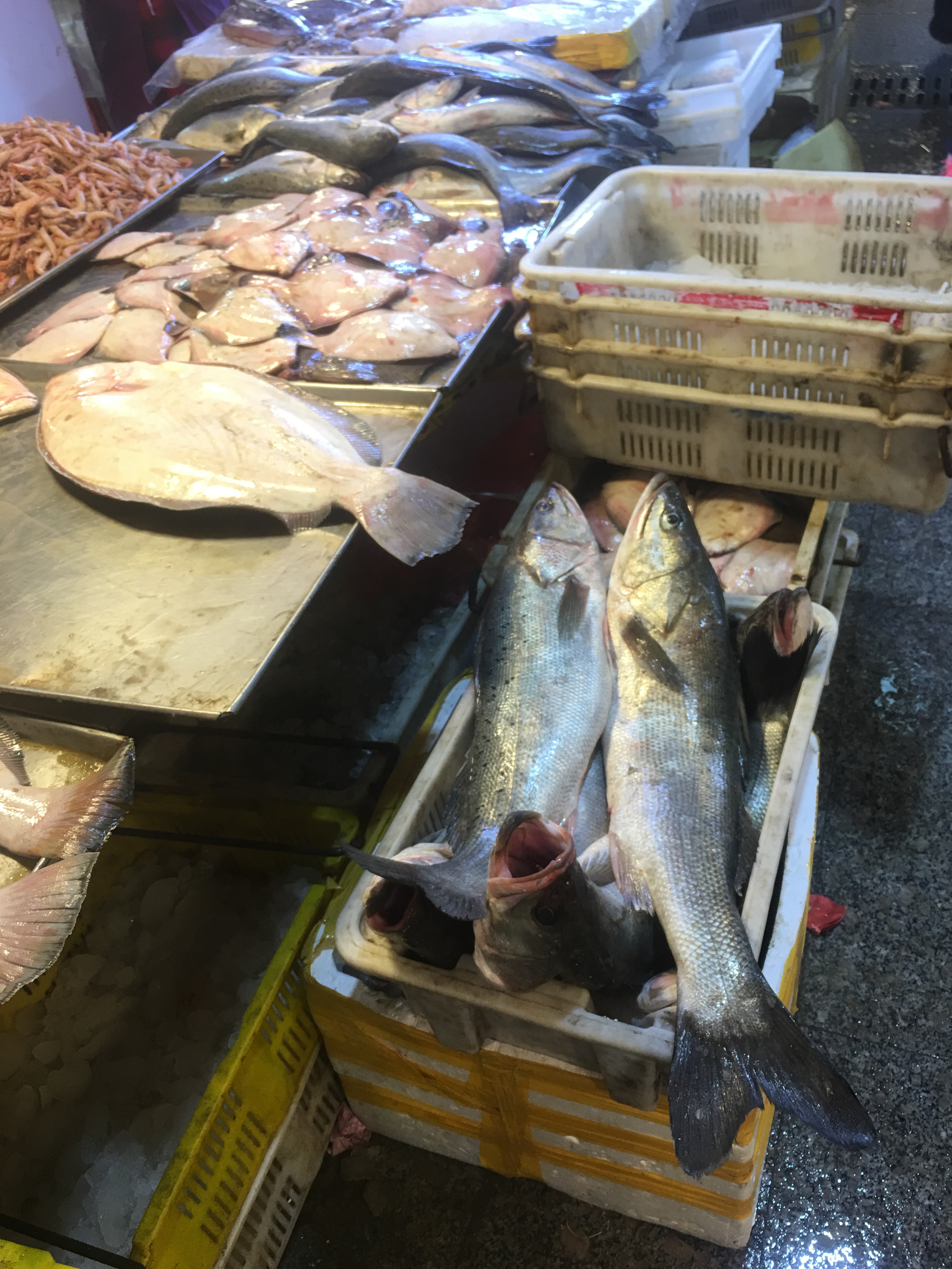 各种海虾,大型的龙利鱼,大约100元一斤。