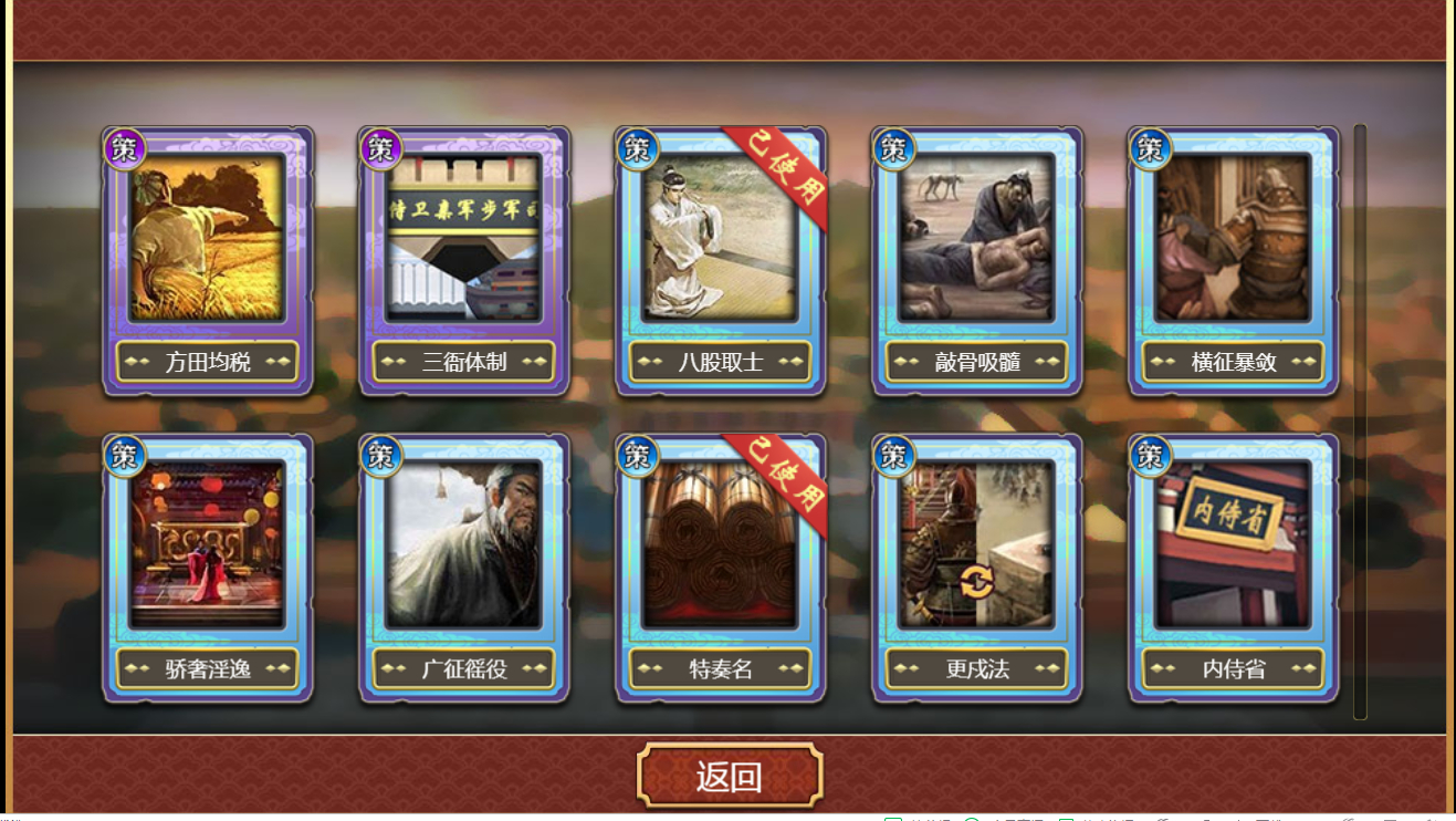 前3回合使用单回合的八股、特奏名、元丰改制,然后方田均税,接着三衙体制。