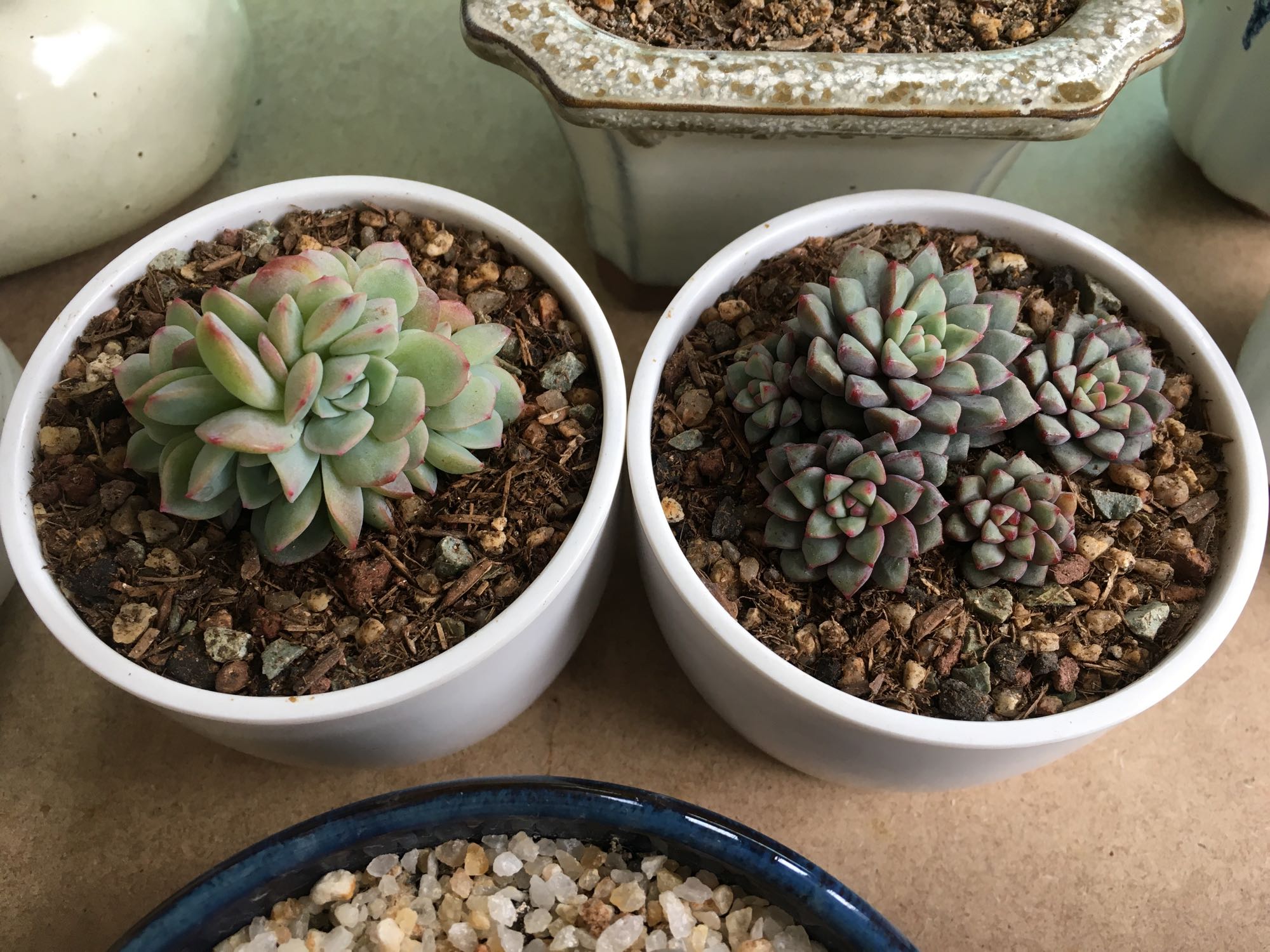 水苔养的菲欧娜和吉娃娃 菲欧娜跟了我两年了 硬是控成了小型种 吉娃娃半年 长得挺好的 喜欢水苔种肉肉 干净透气 唯一的缺点是长不大