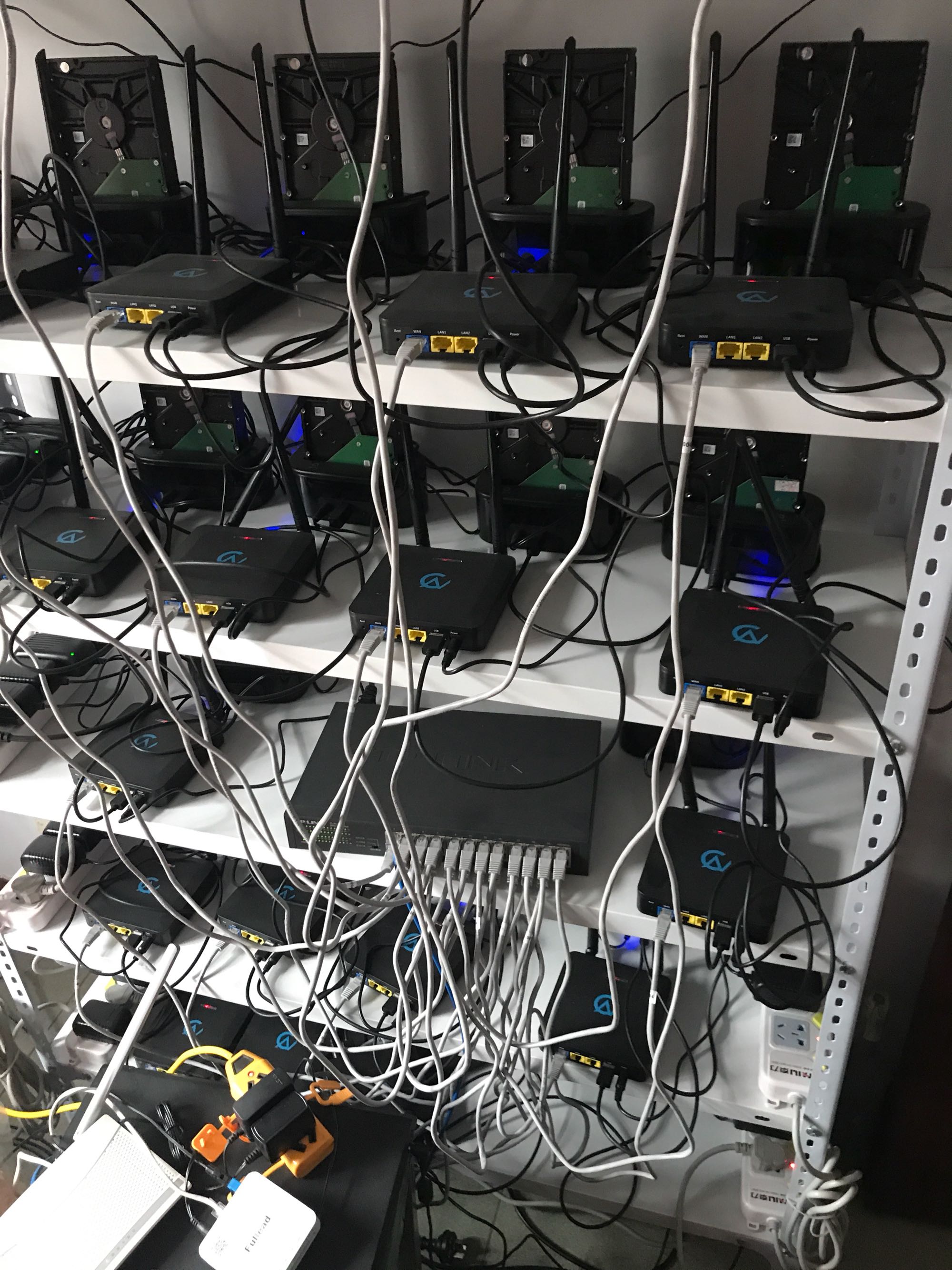 [滑稽]挖矿?别搞笑了 这么多硬盘明显是发布里面的东西 估计是个视频网站或者私人云存储之类的 你可以拿电脑接个网线到其中一个路由器看看硬盘里面都有啥?说不定都是小姐姐哦