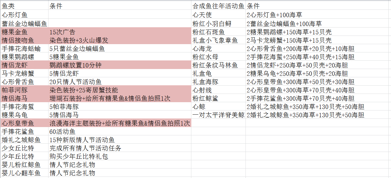 情人节活动鱼(虽然我还没做完)粉色底色的是隐藏鱼,往年鱼如图