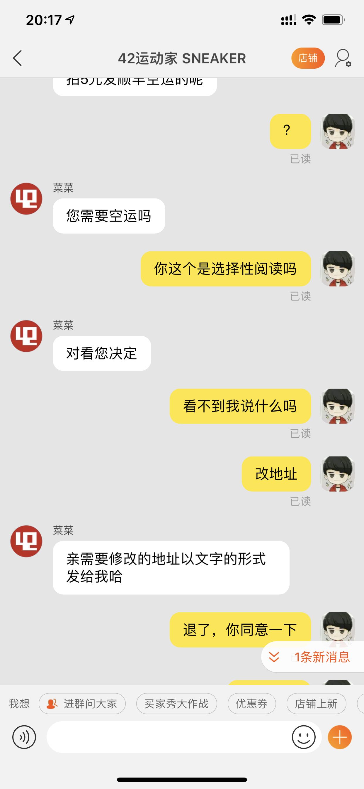 42运动家的客服是瞎了吗?选择性阅读?改地址不理我,加邮费就