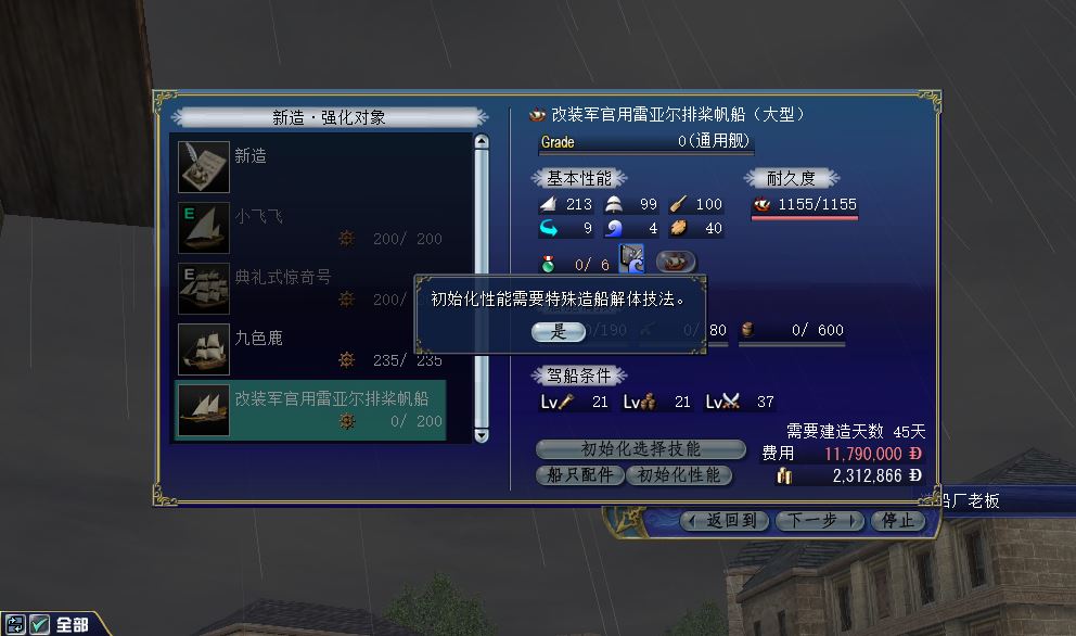 船只的强化性能清零是用的这个道具,使用方法是带着这个道具在身上然后找船厂老板,然后自定义造船,选择要强化性能初始化的船,然后选择初始化性能。然后你在3楼问的有关技能的问题,你看这里这个图上的初始化选择技能应该可以帮你,这个应该是新版本加的内容,我也刚回归还没用过。至于9楼图片里说的改造带来的强化,并不是指强化性能的强化,他这个表述有待推敲,所以9楼那个道具直接使用,只会把G等归零。