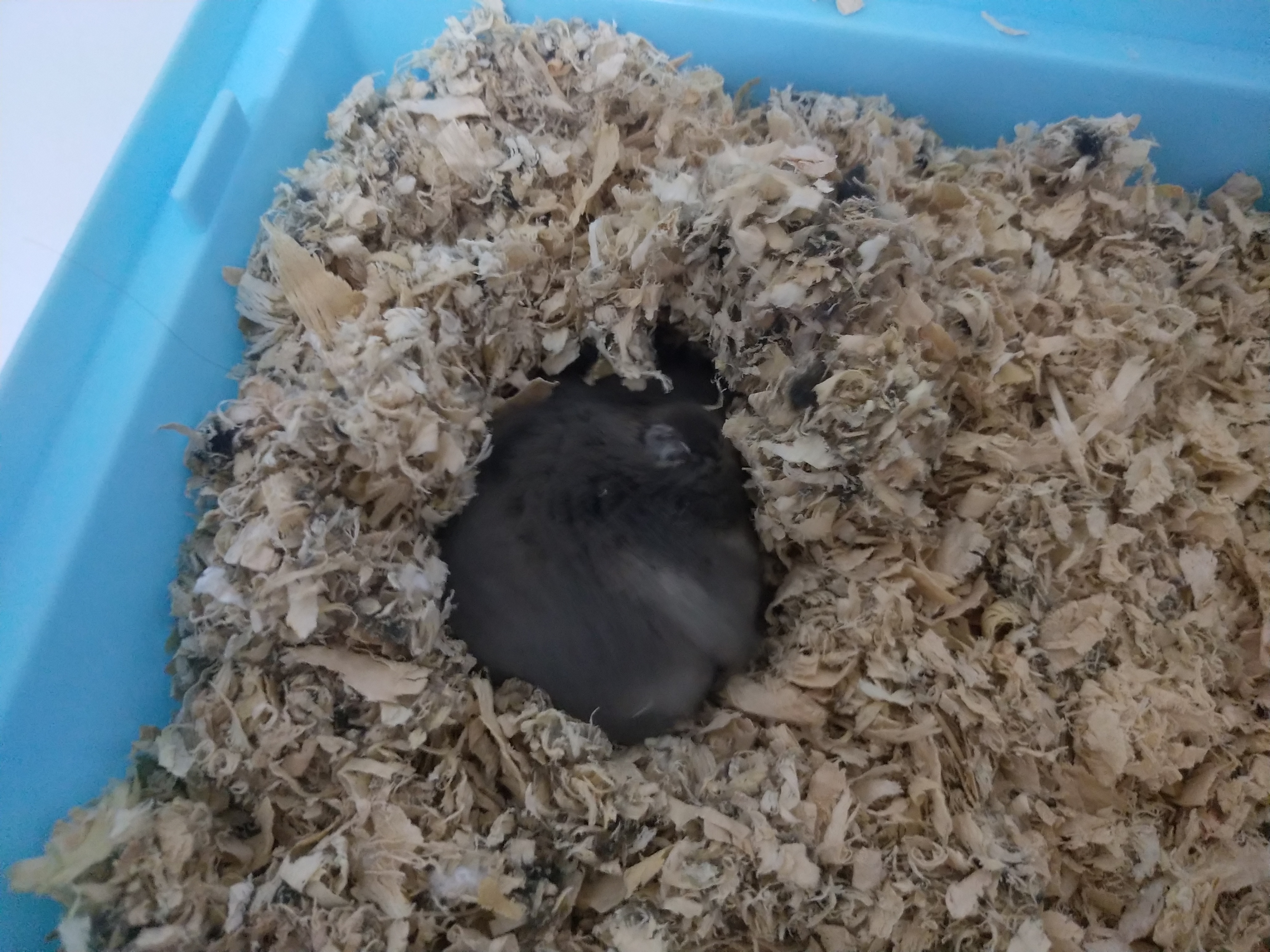 之前就发现会固定在一个地方撒尿,然后把木屑换了放尿砂进去,然后发现笼子角上的木屑被挖开了……