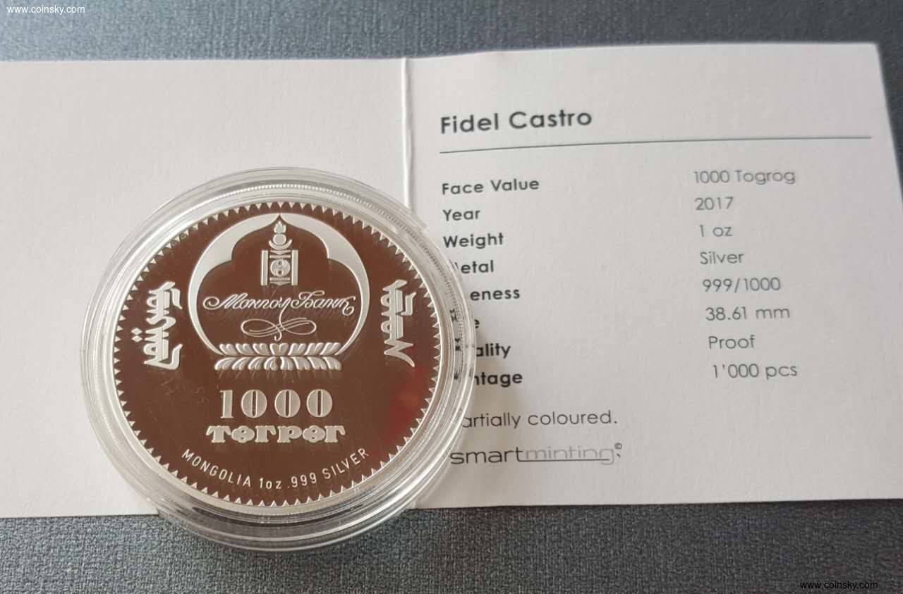 蒙古2017年菲德尔-卡斯特罗1000图格里克1盎司彩色银币和蒙古2018年切-格瓦拉1000图格里克1盎司彩色银币。