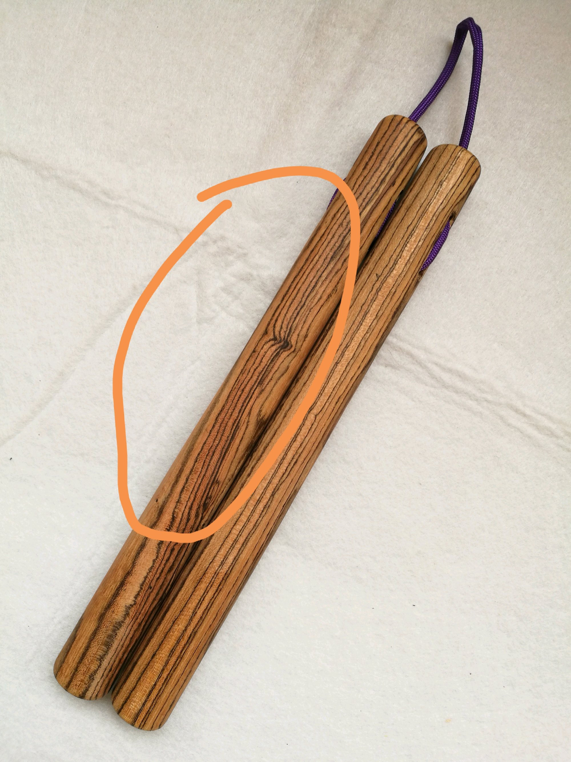 其中一根棍的纹理不好有一段很斜的纹理,这样纹理会使棍体不结实,当时买棍料时商家赠送了一根黄金檀,纹理还行,但是颜色明显比这两根要深一些,没办法只好把这两根凑成一对