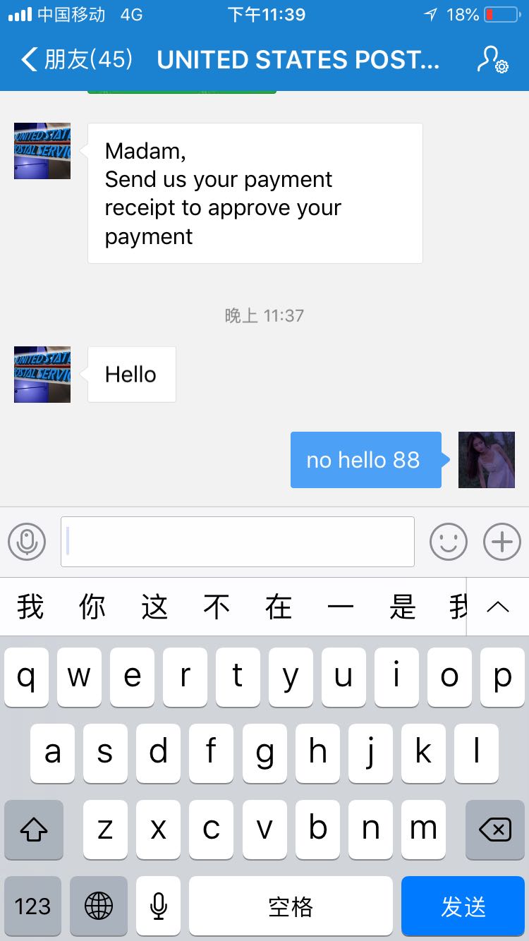 我现在聊的就是这个图片的人,我的天呢,但他并没有跟我说什么垫付,就是聊了几天然后寄了包裹,几天后给了我一个QQ说是快递公司,然后我加了跟我说交关税
