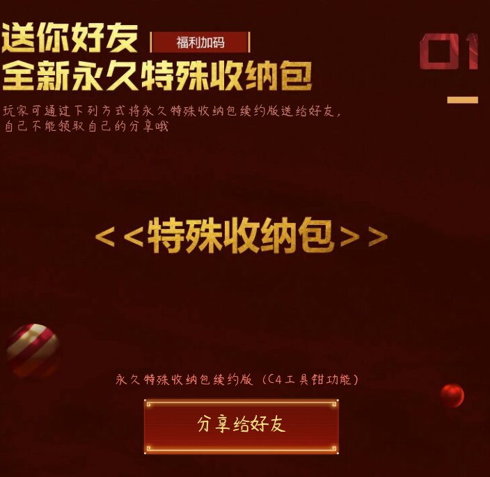 活动可赠送给好友永久特殊收纳包,收纳包拥有c4工具钳功能,成