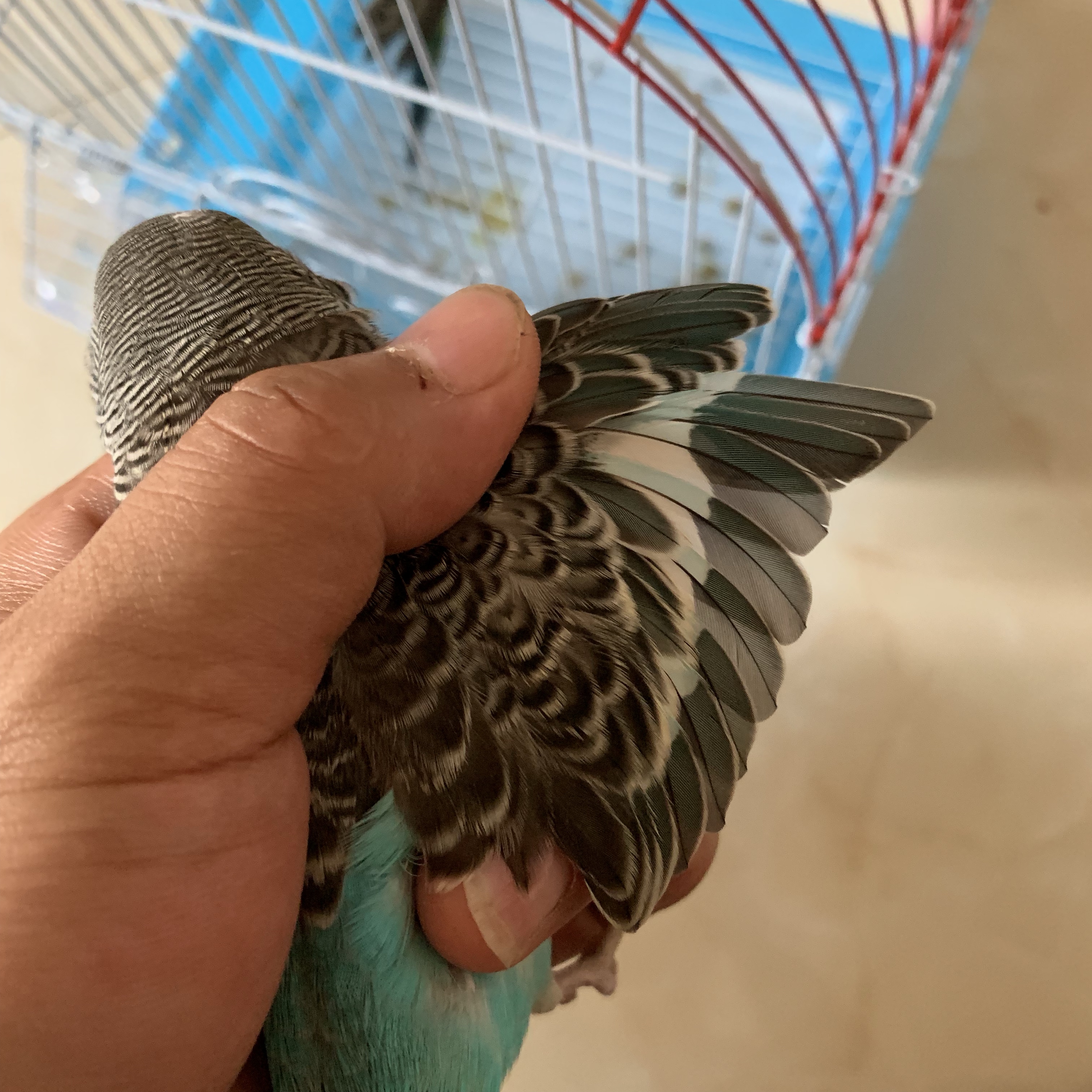 请问一下大家这是怎么回事,两个鹦鹉今天买的,我发现小母(蓝色)翅膀上的大羽毛全掉了,结果我把它拿出来连飞都不会飞,这是换毛吗😳