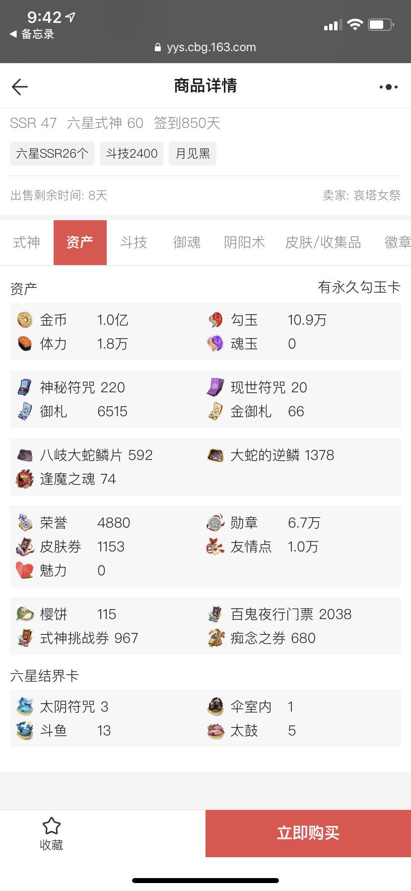 食茨青19s魂十,式神均是独立御魂,10.9w勾玉,6.7w勋章,全图鉴+四只sp+联动式神都有。