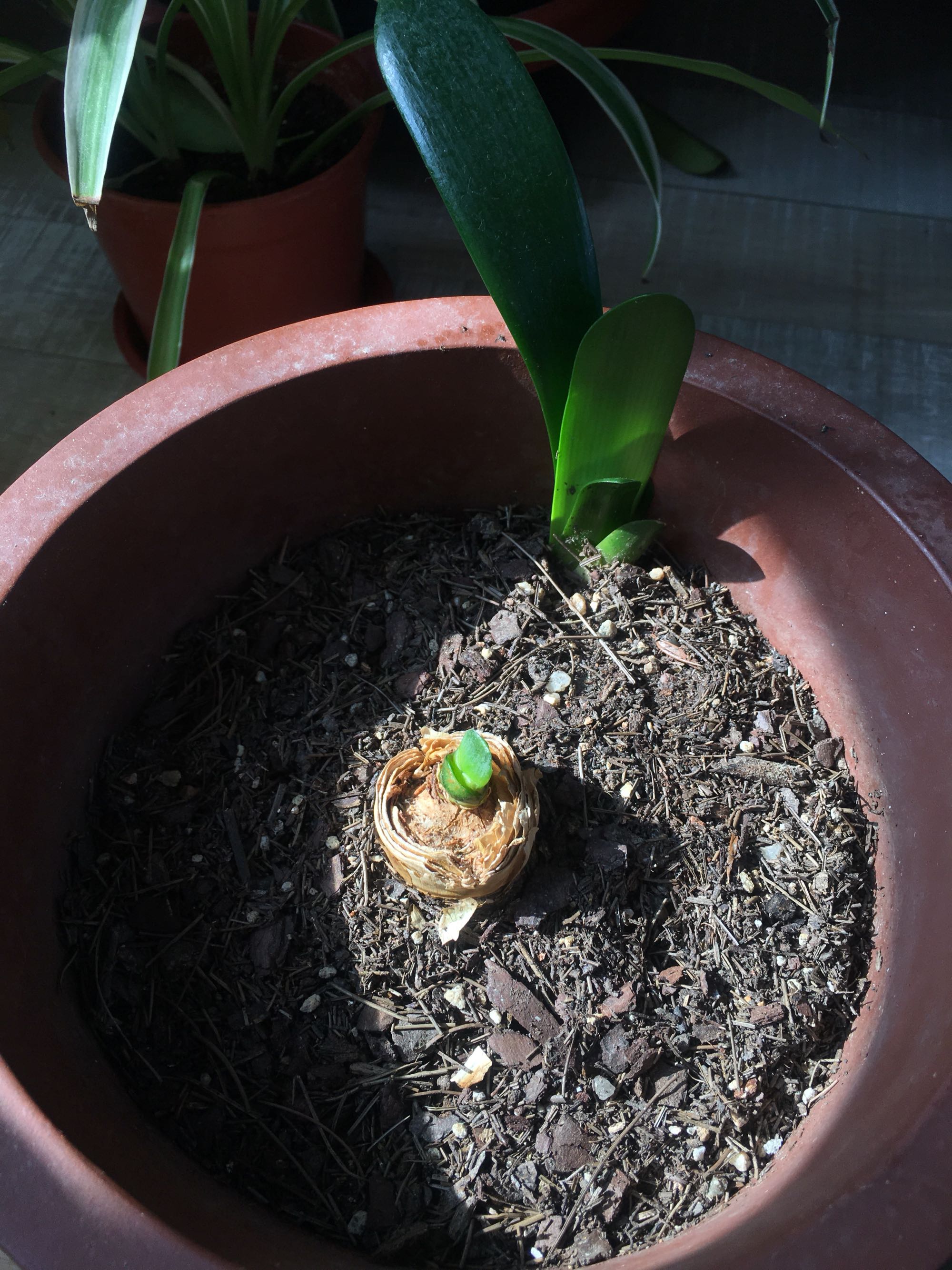 入冬前烂芯烂根的苗砍了头,现在终于冒牙了!侧芽在砍头前就从根部冒头了,但是还没钻出土面,现在也长很高了。琢磨春天要不要分家。