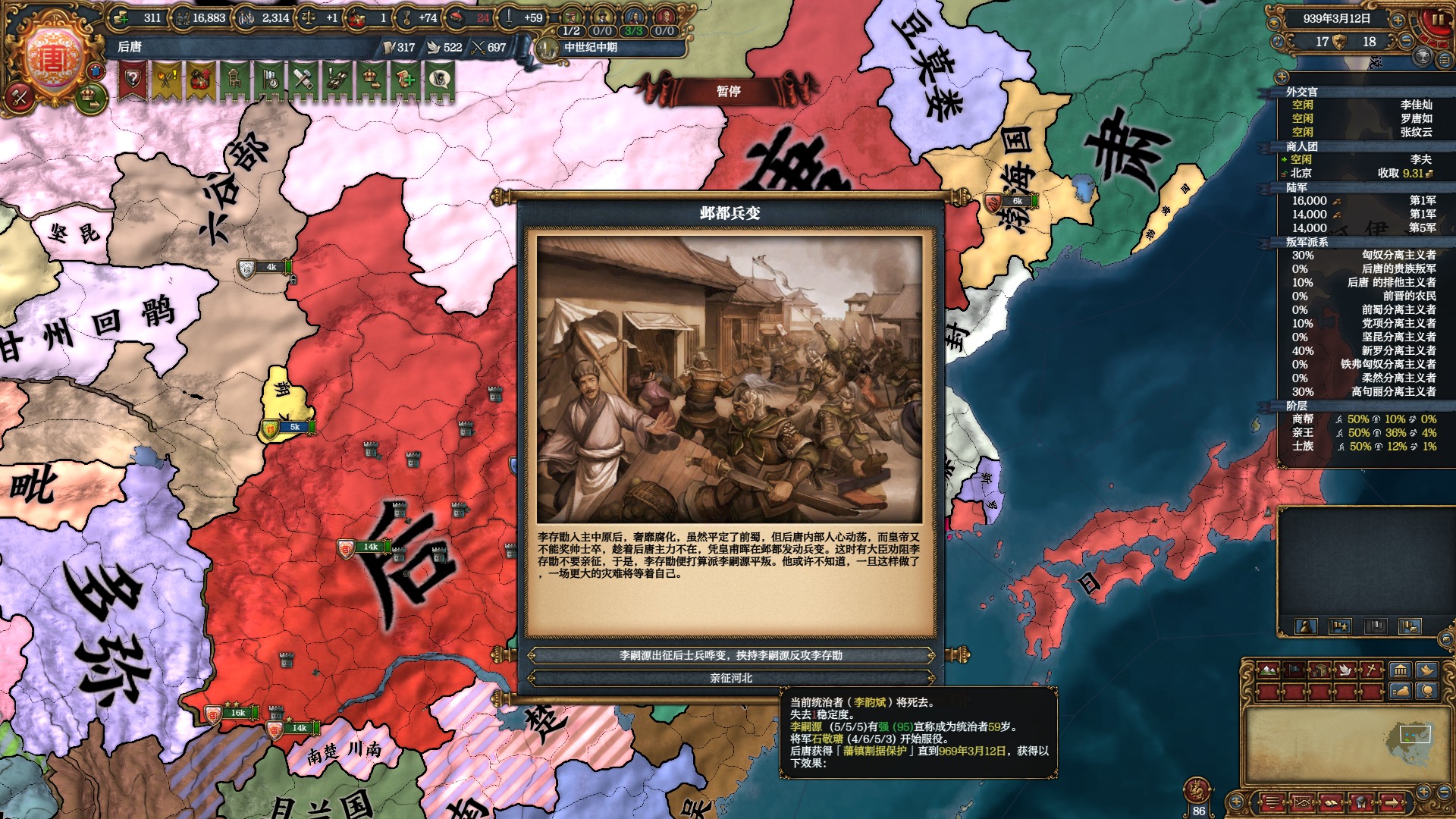 五代到前蜀灭亡基本前晋——后唐都是主角而如果你在前晋时期就直接把没长大的契丹灭了,南下时就不会被契丹兼并领土,灭前蜀后就会看到精忠报国石敬瑭(没契丹没法造反)想走五代前期剧情的话这是最简单的。