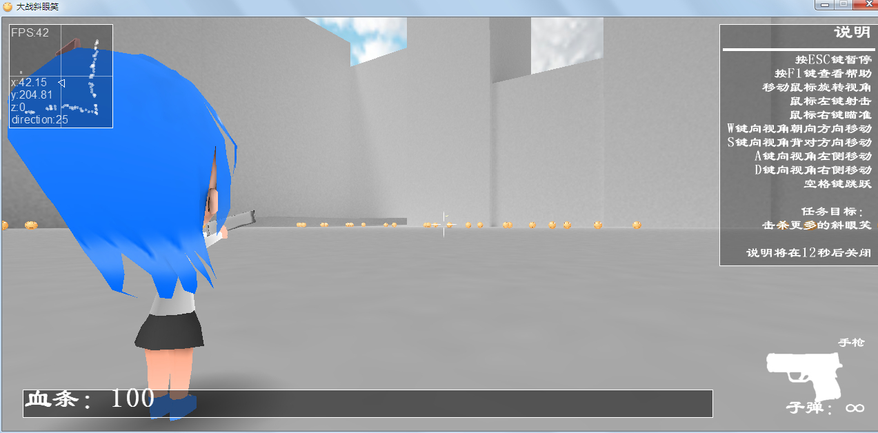 大战斜眼笑是第三人称射击游戏,玩家将控制主角射击斜眼笑来获得更多的分数,主角有一个血条,碰到斜眼笑会掉血,大概是这样的规则
