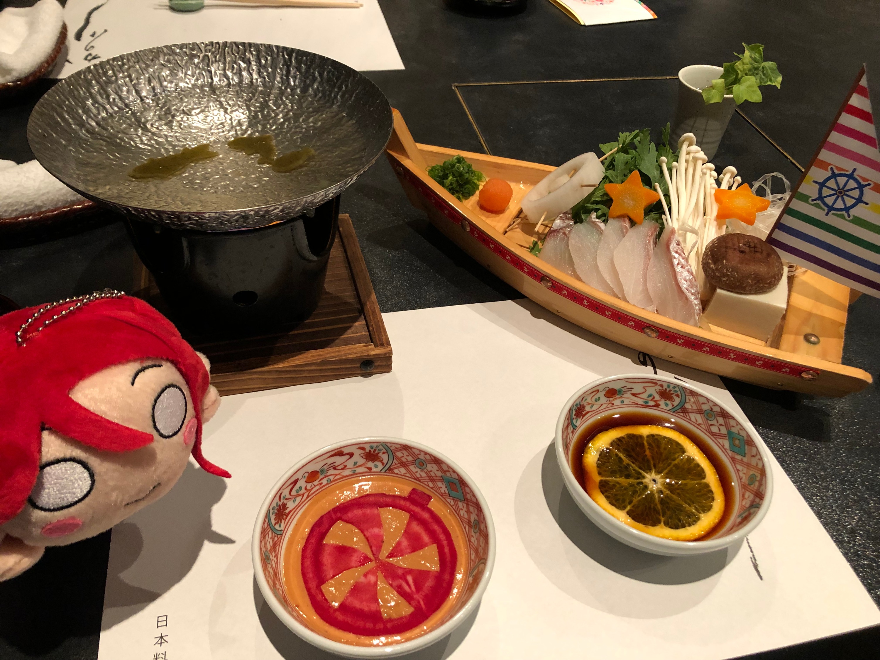 菜单介绍。其他菜品是固定的,主菜则是三选一,分别是代表GK的牛排、代表AAA的天妇罗和代表CYR的鲷鱼涮锅。虽然我俩推的角色都是GK的,然而不知为什么都觉得牛排没什么特色,于是分别选了另外两种。(不过吃完后觉得可能还是选牛排更好些……)
