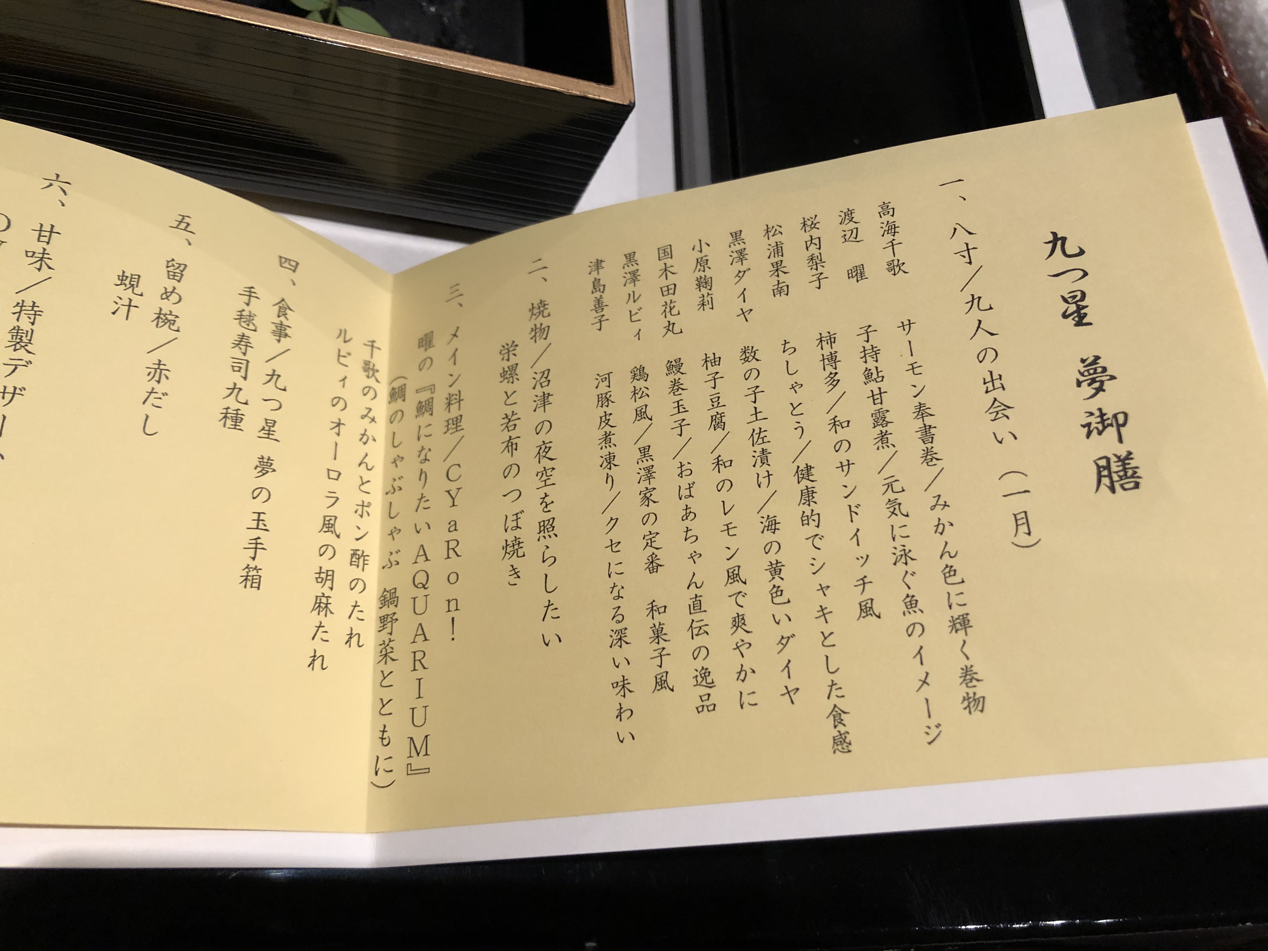 主菜过后是手毬寿司“九星 梦之玉匣”,九种寿司同样对应九人(下面垫纸上有对应颜色)。这个寿司盒也是可以自己带走的,盒子的系绳还可以自选颜色(九人应援色中选择一种)。此外还有加了蚬子的赤味噌汤。