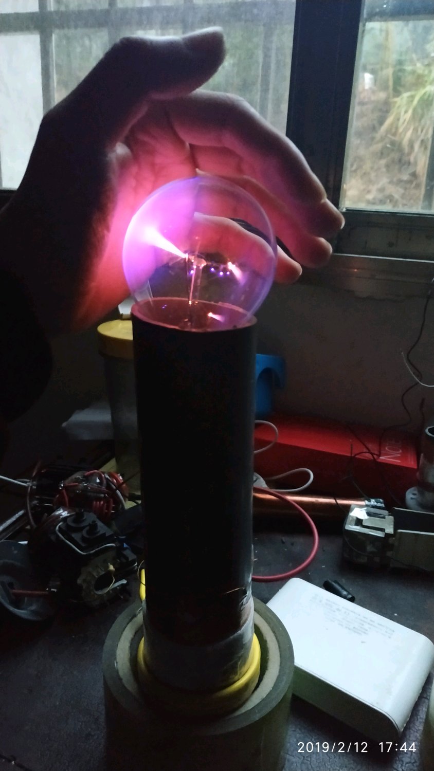 ,把高压包的次级一端接地(我是接在防盗窗上),另一段接白炽灯,接通电源,灯丝开始喷弧,手靠近,更明显