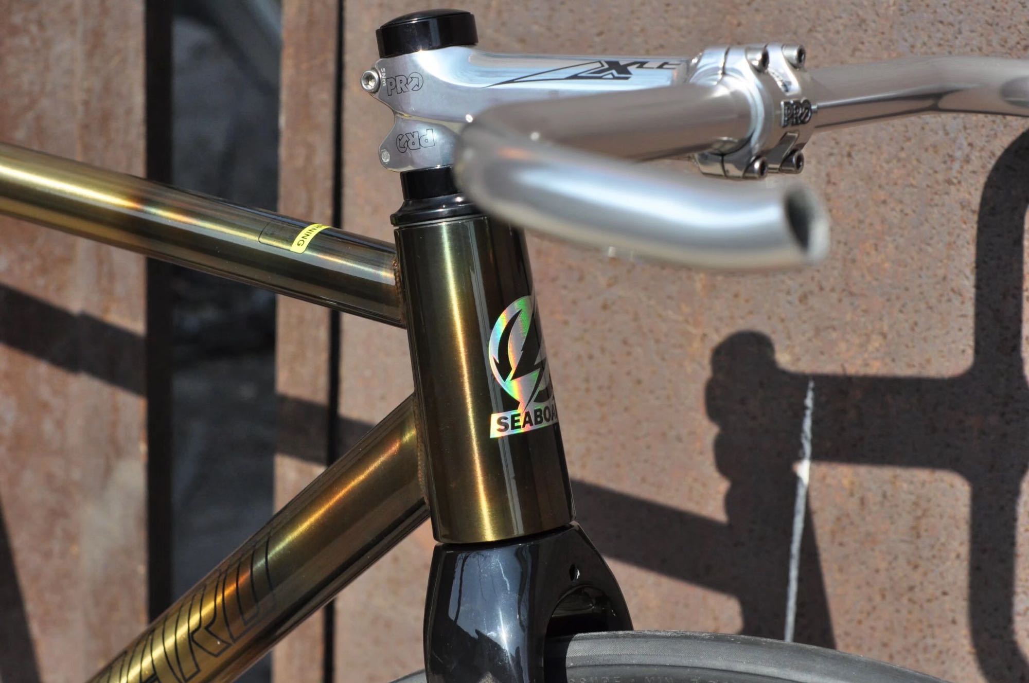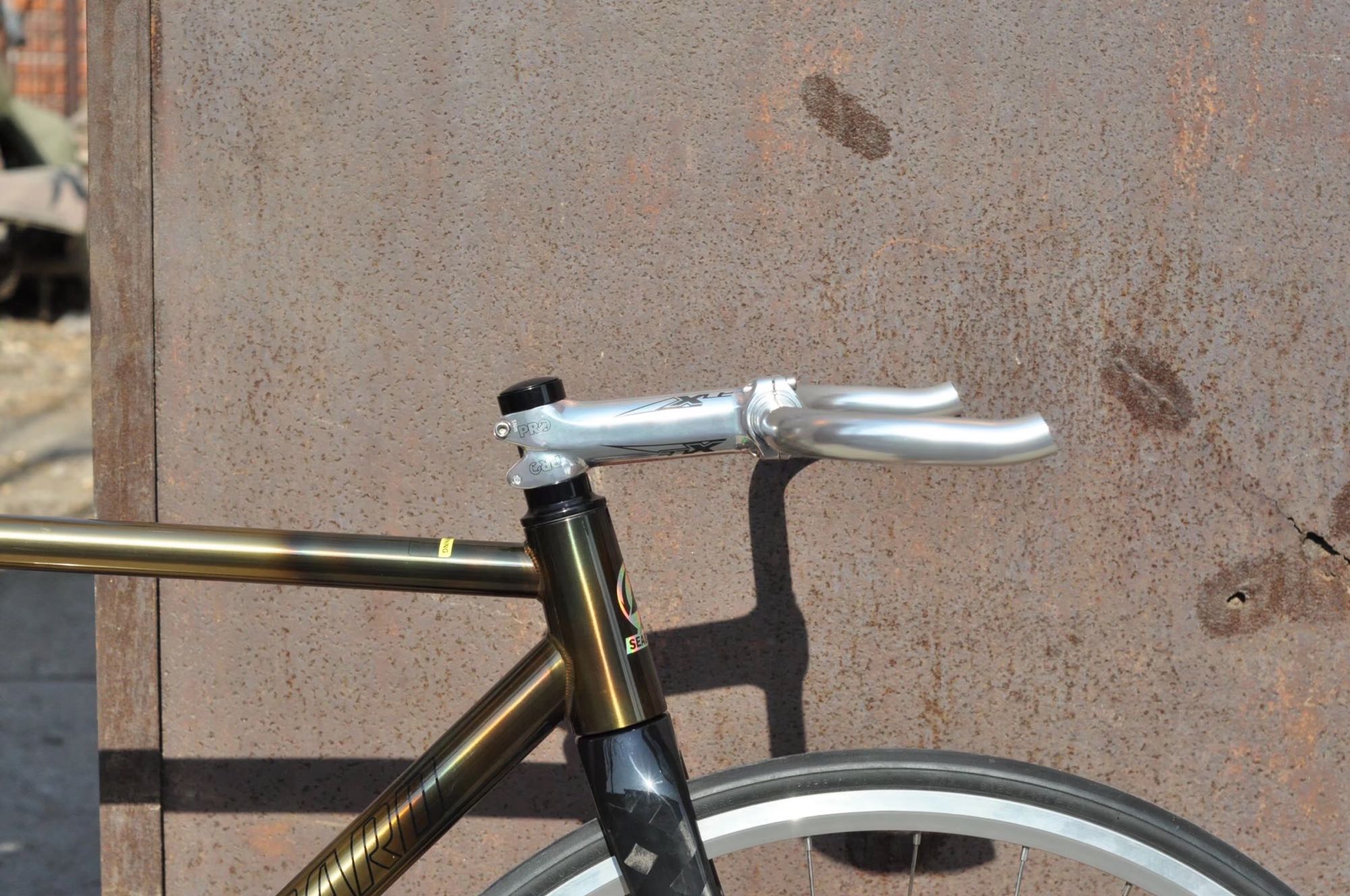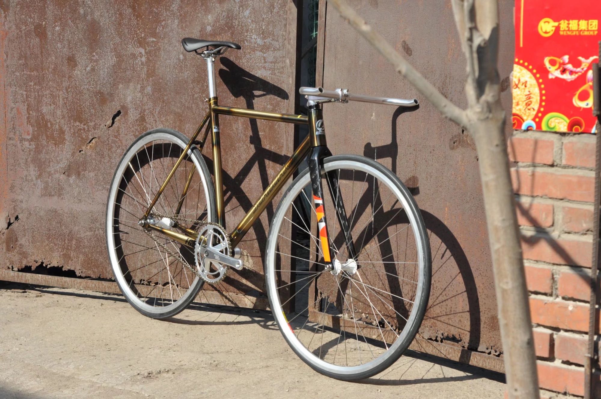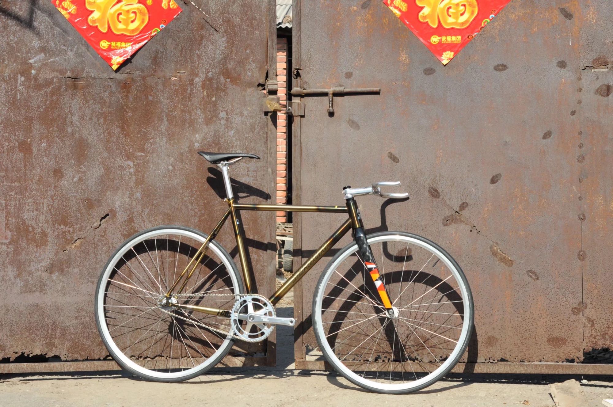 死飞这个东西就跟你的灵魂是想通的 你的想法可以尽情的表达在他上边 但是很多时候你想象出来他的样子跟你实际出来的效果是不相通的 由于这台车架是尝试的第一次玩法 烧制铜色 阳光下比较靓 暗地方会偏黑 全黑色搭配会让整车整体偏暗色系 体现不出来这台车架的靓