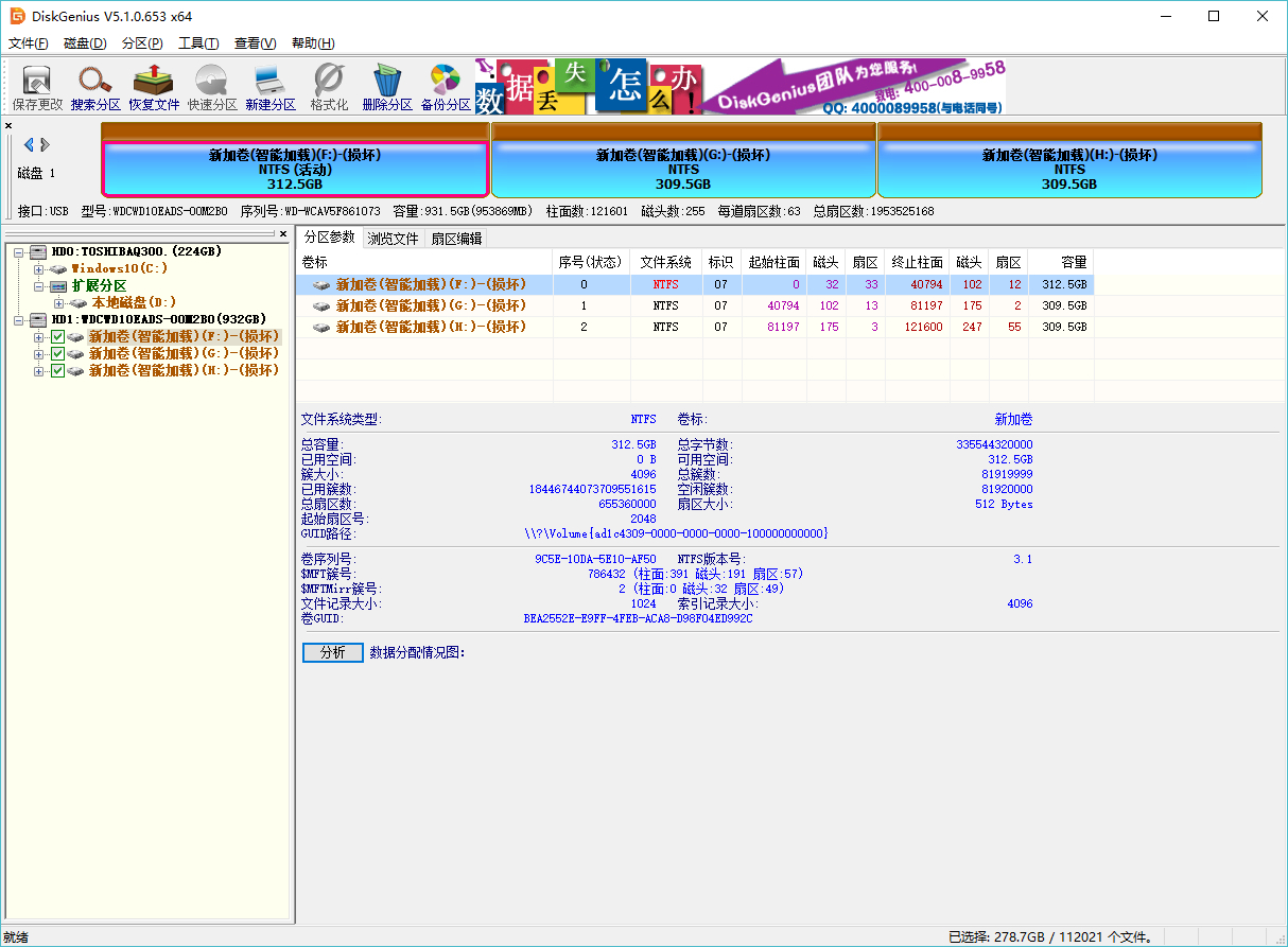 免费版的DiskGenius,之前该硬盘出现过几次分区表丢失的情况,使用DiskGenius都能恢复回来,这次使用了“坏道检测与修复”后,盘符后多了“损坏”字样,不能保存分区表,使用智能加载后,浏览文件重能显示文件,重新加载后,文件不能显示!!!