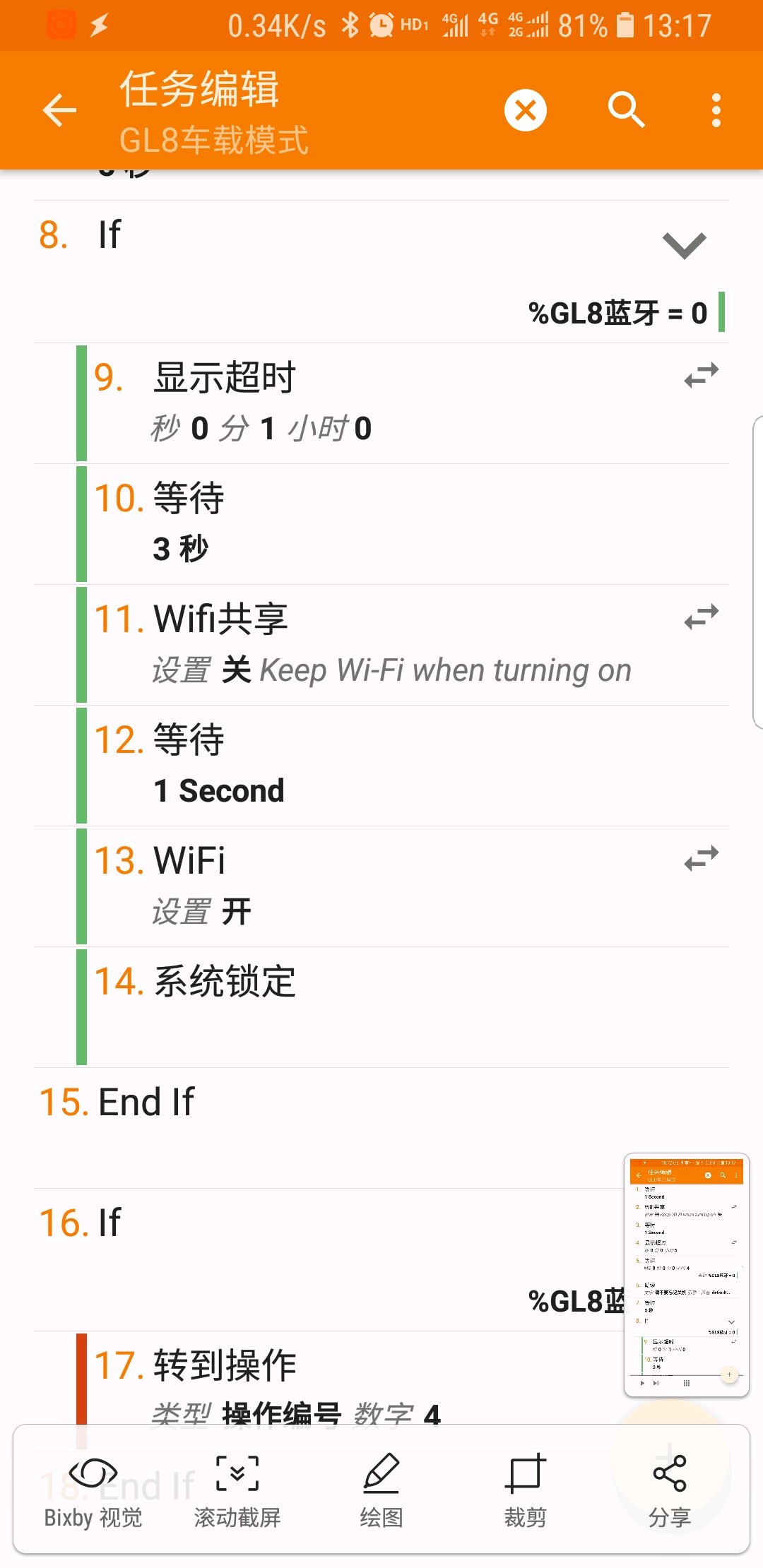 之所以搞得这么麻烦,是因为考虑到汽车重新点火后车载蓝牙的关闭问题,我的车载蓝牙是网上购买的蓝牙音频模块,连接汽车点烟器的12v电源,当汽车重启时会供电会中断,考虑到汽车熄火-不开车门时通电10分钟左右,坐在车上听音乐,如果重新发动汽车,蓝牙会断电,这样的话就比较烦。所以按照上面的任务执行后,因为tasker在蓝牙断电5秒后再重新确认你的蓝牙是否断开,如果没有重启汽车,没电,那么手机就会关闭wifi共享后锁屏,而如果你马上重新发动汽车,5秒内蓝牙就会连接,这样tasker就重新执行之前的一部分任务,而不会关闭wifi共享。当然,这中间的任务你可以自己再加上一些,比如自动解锁屏幕,自动运行听歌的程序,自动开启导航等等,只有注意最后第二步的-转到操作-数字-进行更改,更改到你希望重新运行的任务就可以了。