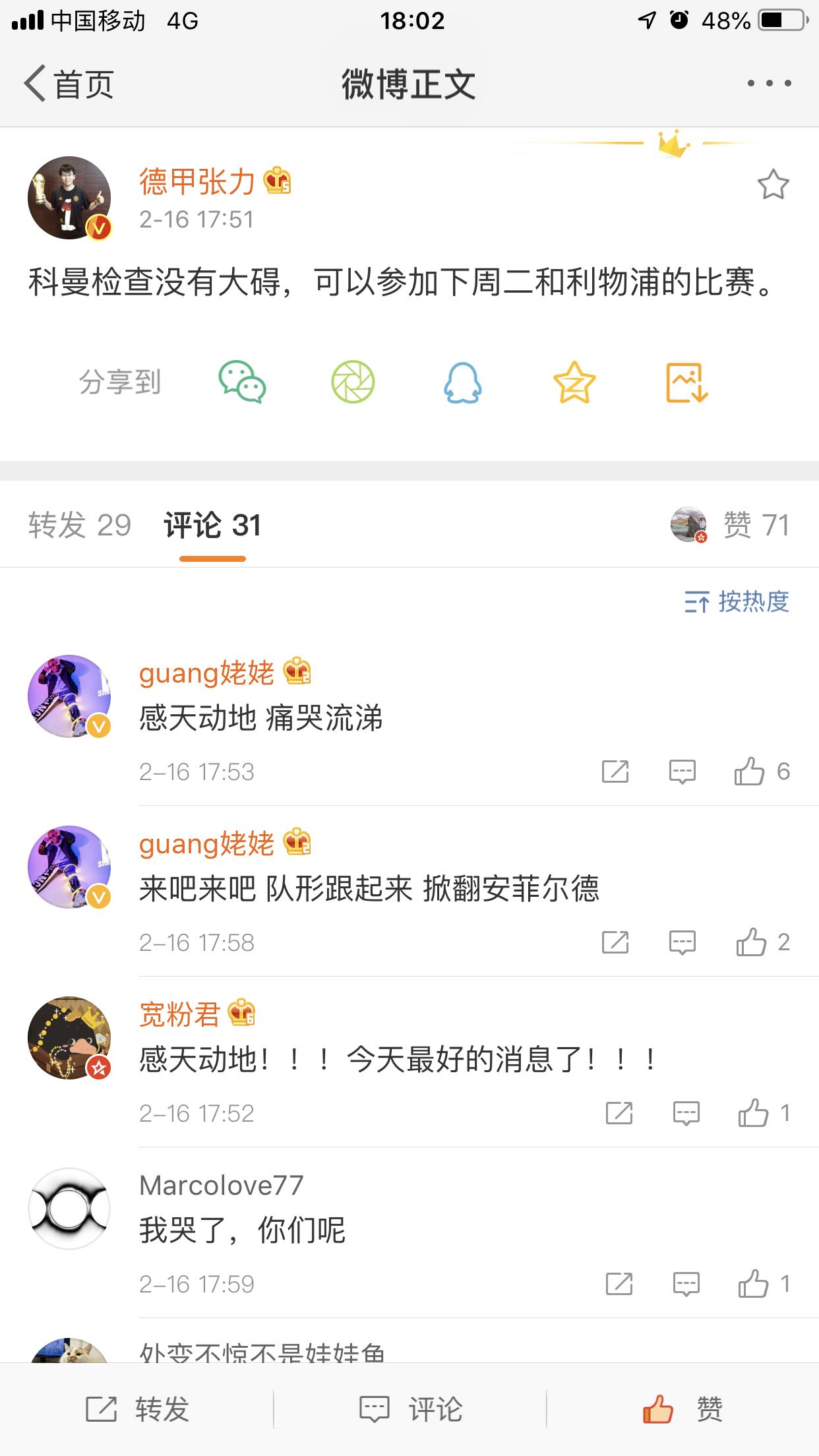 张力:科芒伤势无大碍,可以出战与利物浦的比赛