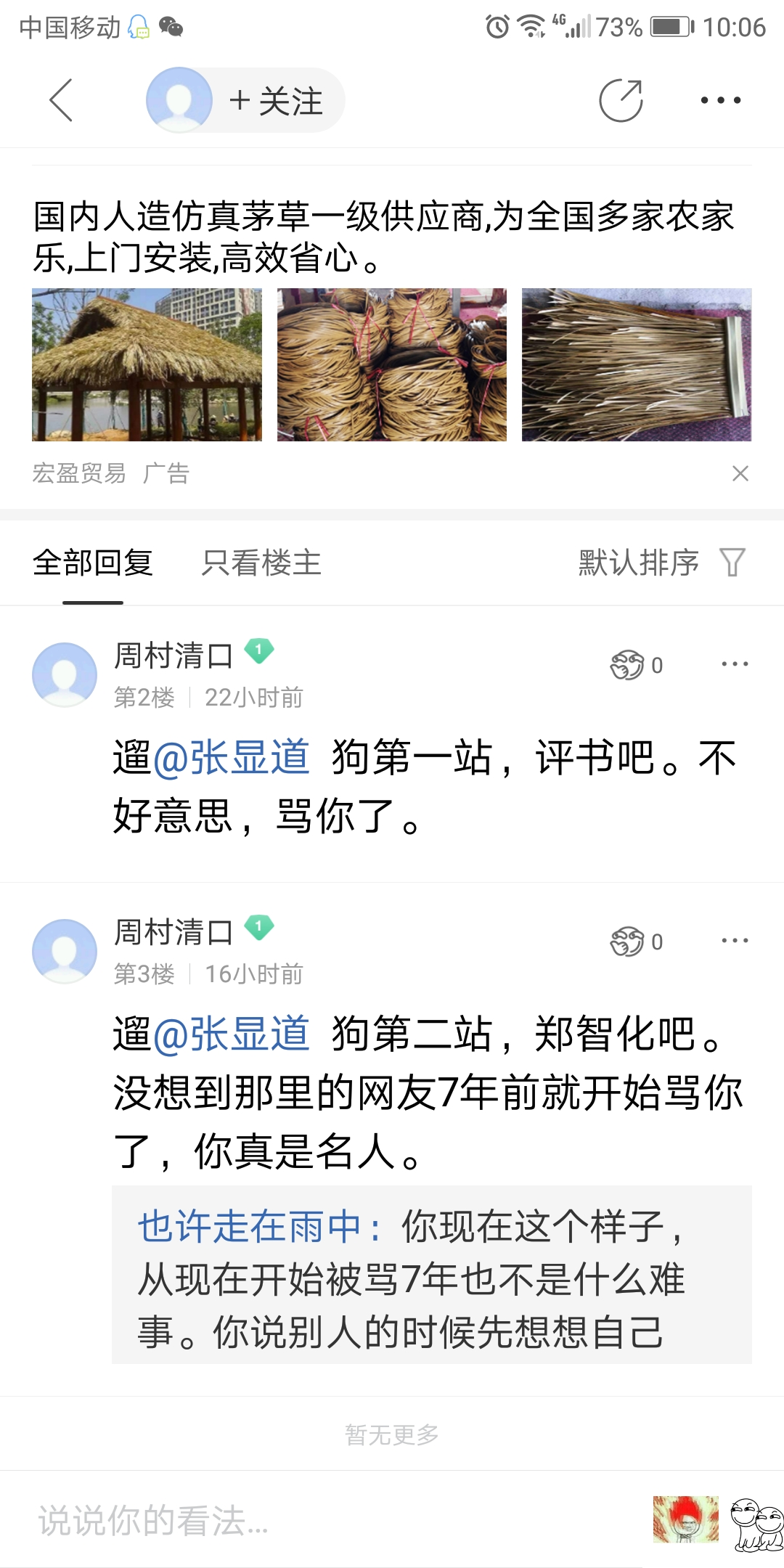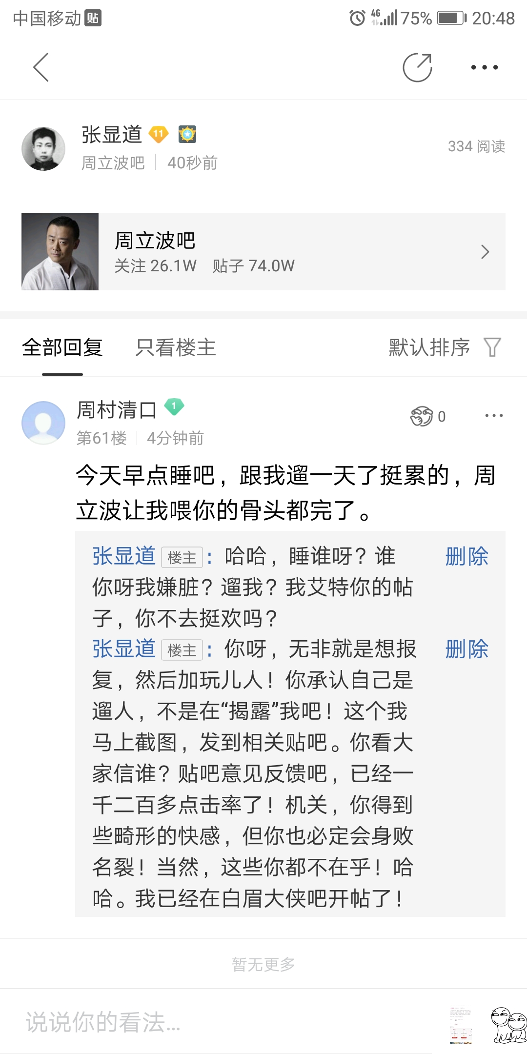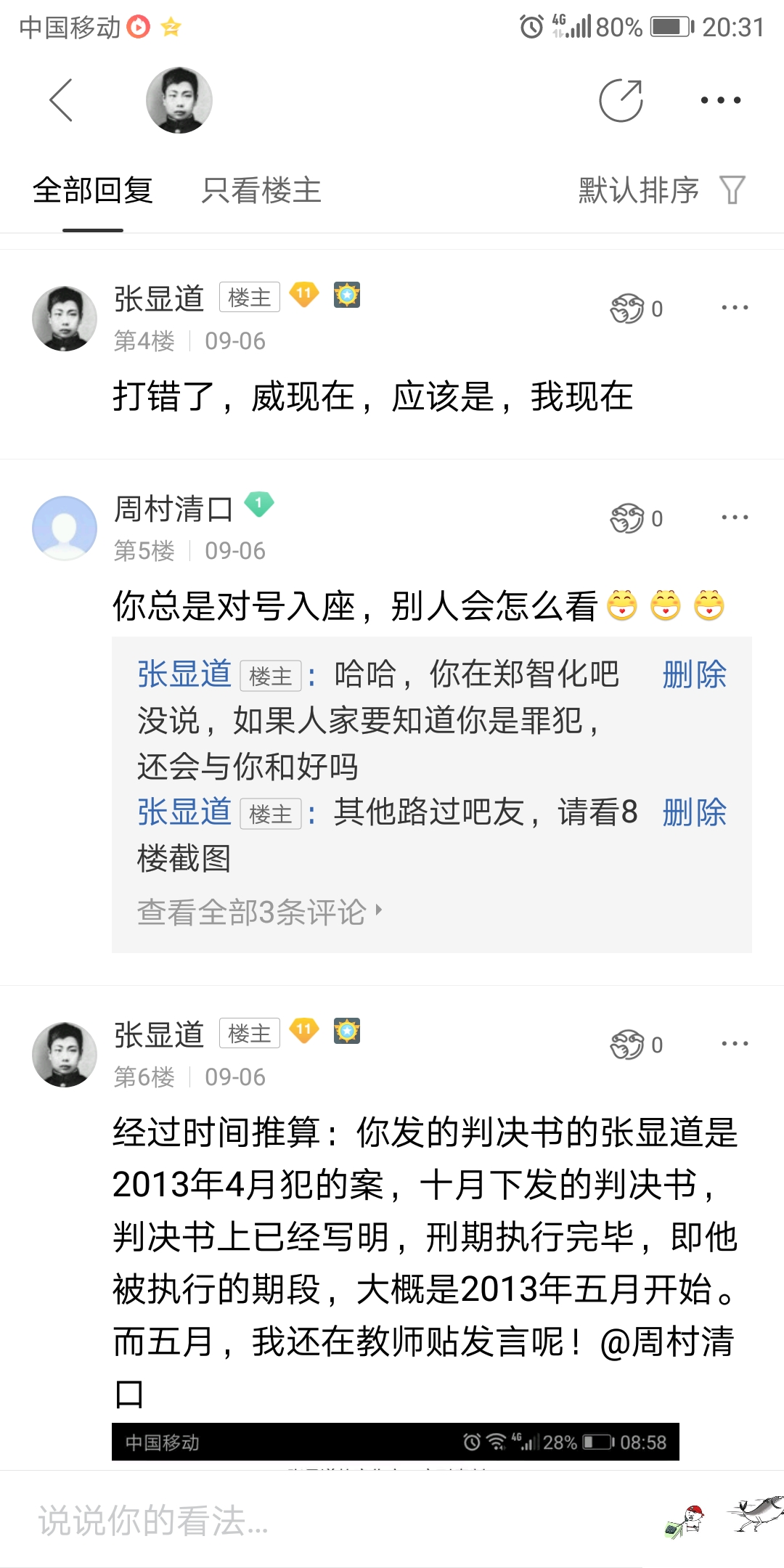 再次,他们多次骚扰和栽赃,大多数,我是不理的,只顶回旧帖。我本意,并非让他们帮我圈粉,而他们乐此不疲的去我常去的吧的栽赃和骚扰,着实让我涨了不少粉。真实,有趣的很。