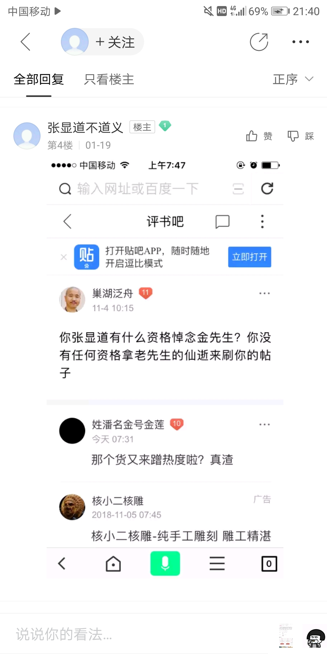 最后,引用鲁迅先生,两句话,“最高的轻蔑是无言,甚至连眼珠都不转过去!”——事实上,大多数时候,他们在我回复别人其他话题的楼中楼,不顾楼主和贴吧的秩序和主题,骚我的话,我基本上是不回的;“沉默呵,沉默呵,不在沉默中爆发,就在沉默中灭亡!”——因此,我也经常揭发他们,在我看来的丑行。