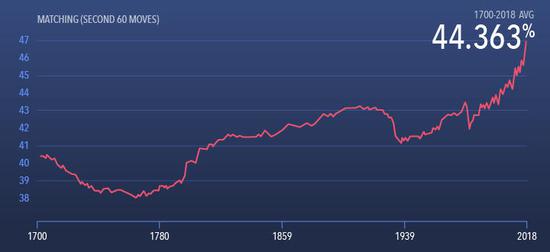 从 1700 年 到 2018 年,围棋比赛中间阶段(第 60 步到 120 步)围棋职业棋手的落棋方式与 ELF OpenGo 所推荐的落棋方式的一致性百分比。