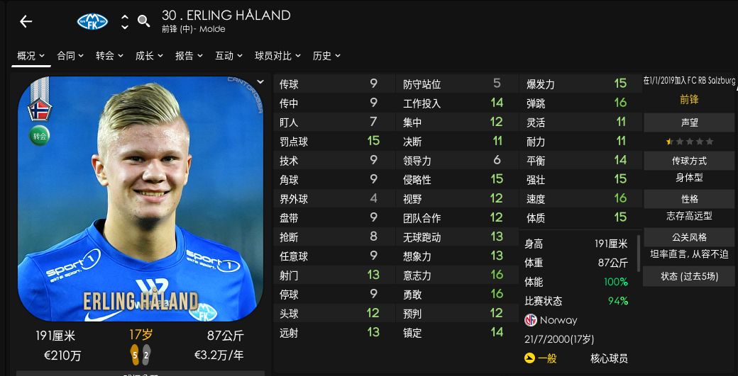 单脚怪之一,隐藏爆炸,打什么前锋都行,重新训练边锋也行,16岁还可以当青训,就是初始ca太低,至少放在u18半赛季,u23半赛季,等到ca到110上下就可以上一线当替补了,基本第二年开始就20球+了,这时候才17,无敌。而且因为年轻,练强壮可以加身高体重。亲测英超中下游开档就可以签了。