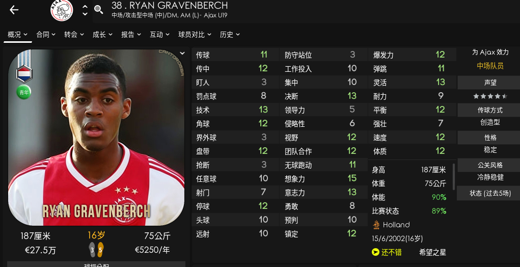 但是强在进攻,远射和任意球都可以,强撸可以到15。双速和强壮也可以练到15,打伪边锋和进攻型中场非常猛,千万别打全能中场,会被过得生活不能自理。