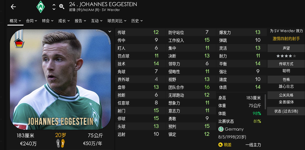 Eggestein,蛋弟,蛋哥也挺厉害,不过是中场,蛋弟冬窗基本闹事,挂牌价一般都是950W上下,也是速度太低,但是这个比较好练,练一年多就能到15,其他属性都很不错,经常镜头都是后场长传他反越位进球。