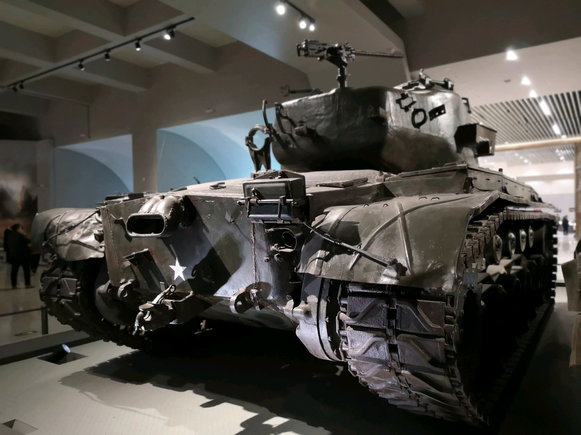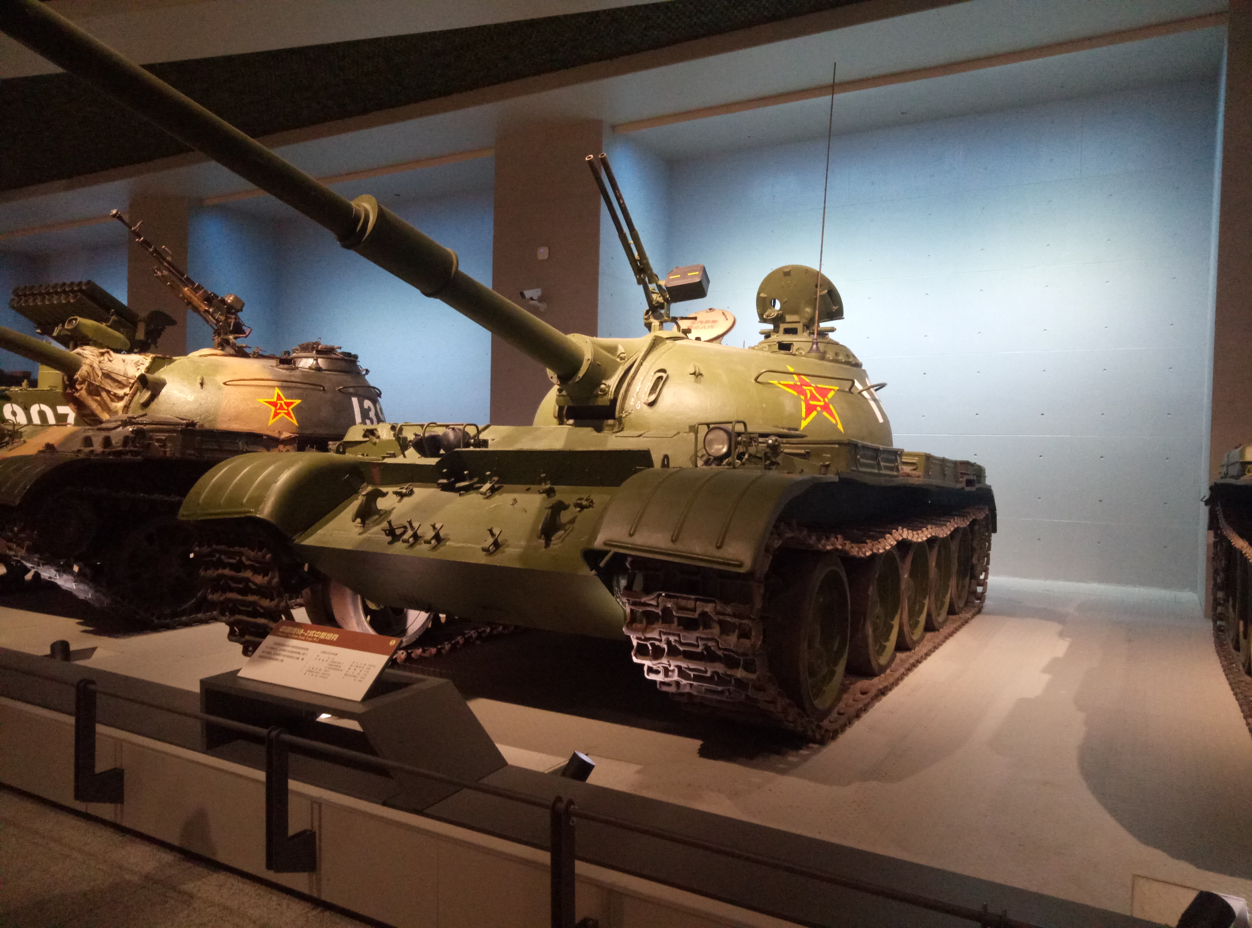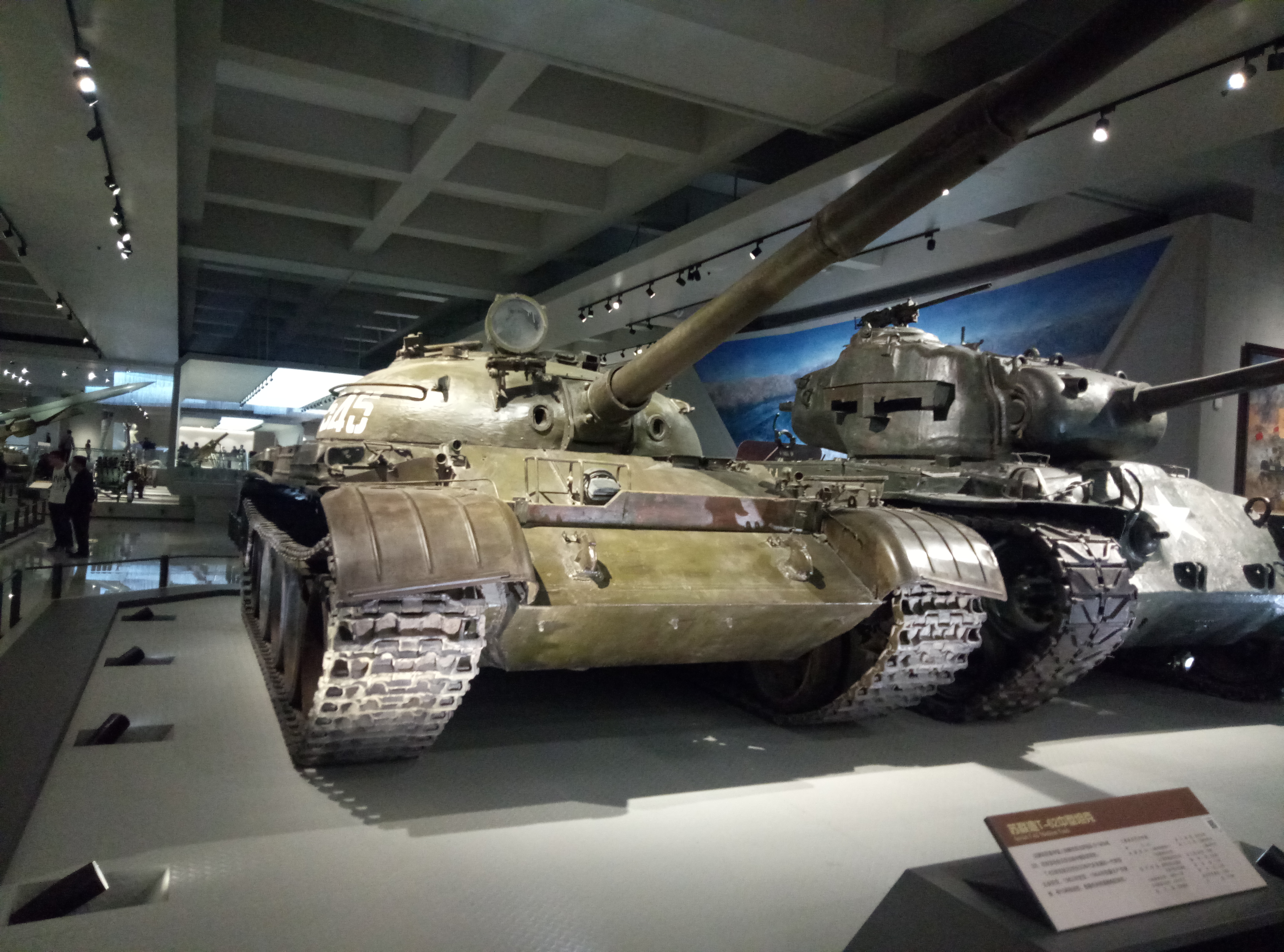 乘坐扶手电梯下到地下一层,这一层分两个展厅,一个是地面装备展区,一个是新征集的藏品展区(以老兵收藏和烈士遗物居多)。一进地面展区门口就正面看到了两个大家伙。分别是珍宝岛自卫反击战期间缴获自苏军的T62A和朝鲜战争期间缴获的美军M26A1潘兴坦克。两辆坦克被摆放在场馆前中央可以被360°围观,所以我多拍了几张特写。