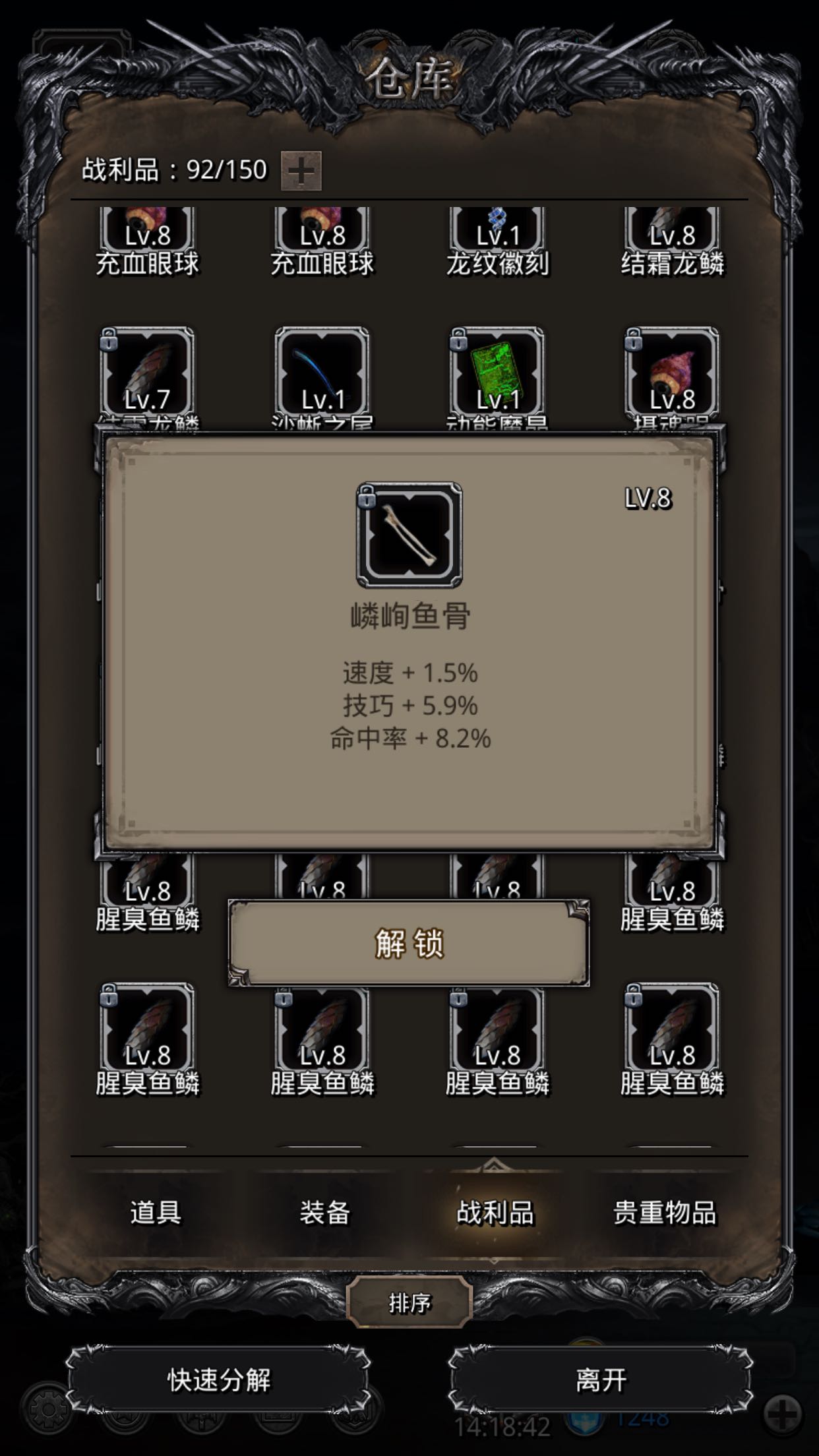 今日图16的战利品,总体来说鱼骨头和锁甲残片成品率好低,战利品这个坑真是无底洞。