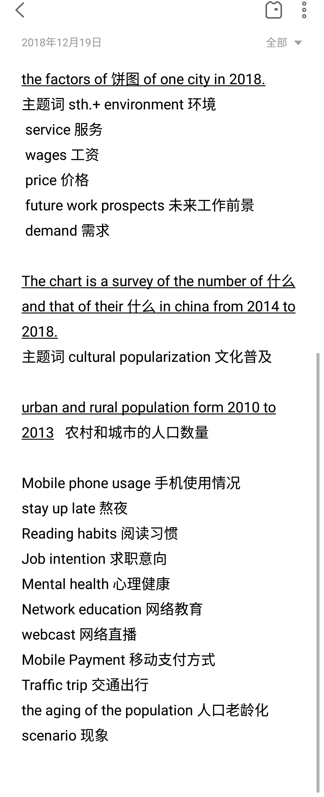 这是考研作文的一些小木板,和预测的一些主题词,这里是真记住几个单词,还算有用~比如说交通出行 Traffic trip 我就在小作文看到了,但是我以为写推荐出行方式,没想到这是个写辩论赛的。
