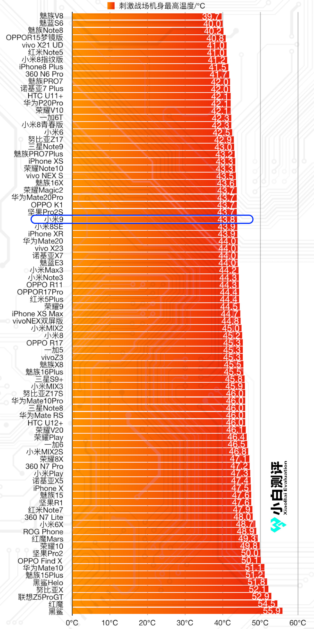 B站有个视频,满电玩吃鸡到没电,室温27度下,米9最高也才35°左右。怎么差这么多。
