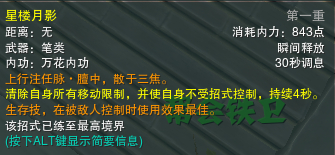 打断技能,对目标造成极少量的伤害同时打断对方读条并使其四秒内无法施放内功招式,持续四秒。