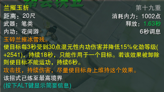 它的主要作用是给一个控制,值得注意的是由于阳明指命中芙蓉定身目标可刷新芙蓉并蒂,所以可以芙蓉阳明芙蓉阳明芙蓉。。。。。。不断循环来达到一个无限单体控制的目的,当然对于boss来说基本是没有任何作用的,但对于一些特殊情况下的特殊小怪,比如战兽山老五打完了以后会出的那个逃兵还有荒血路老五T没有第一时间看好信仰暴徒等情况下可能比想象中的还好用。