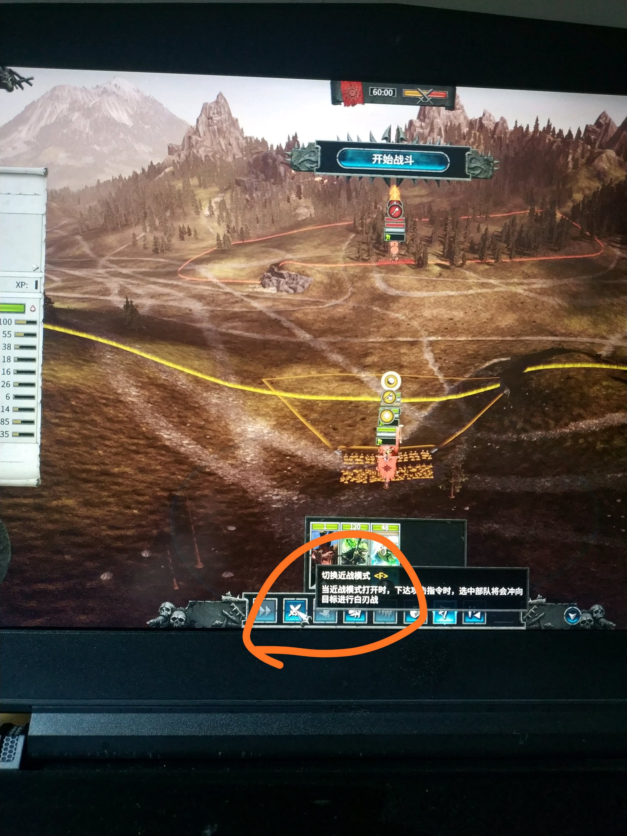 把新手教程打了就知道了,兵种命令栏下面第二个,两把剑交叉的图标