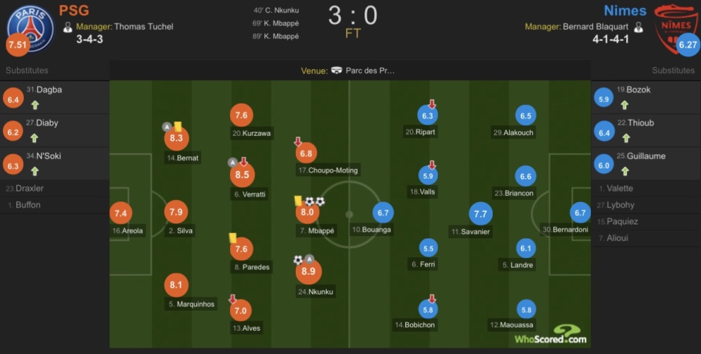 巴黎圣日耳曼(4-4-2):16-阿雷奥拉、2-蒂亚戈-席尔瓦、5-马尔基尼奥斯、14-贝尔纳特、13-阿尔维斯(73'达格巴)、20-库尔扎瓦、6-维拉蒂(81'恩索基)、8-帕雷德斯、24-恩昆库、7-姆巴佩、17-舒波-莫廷(80'穆萨-迪亚比)