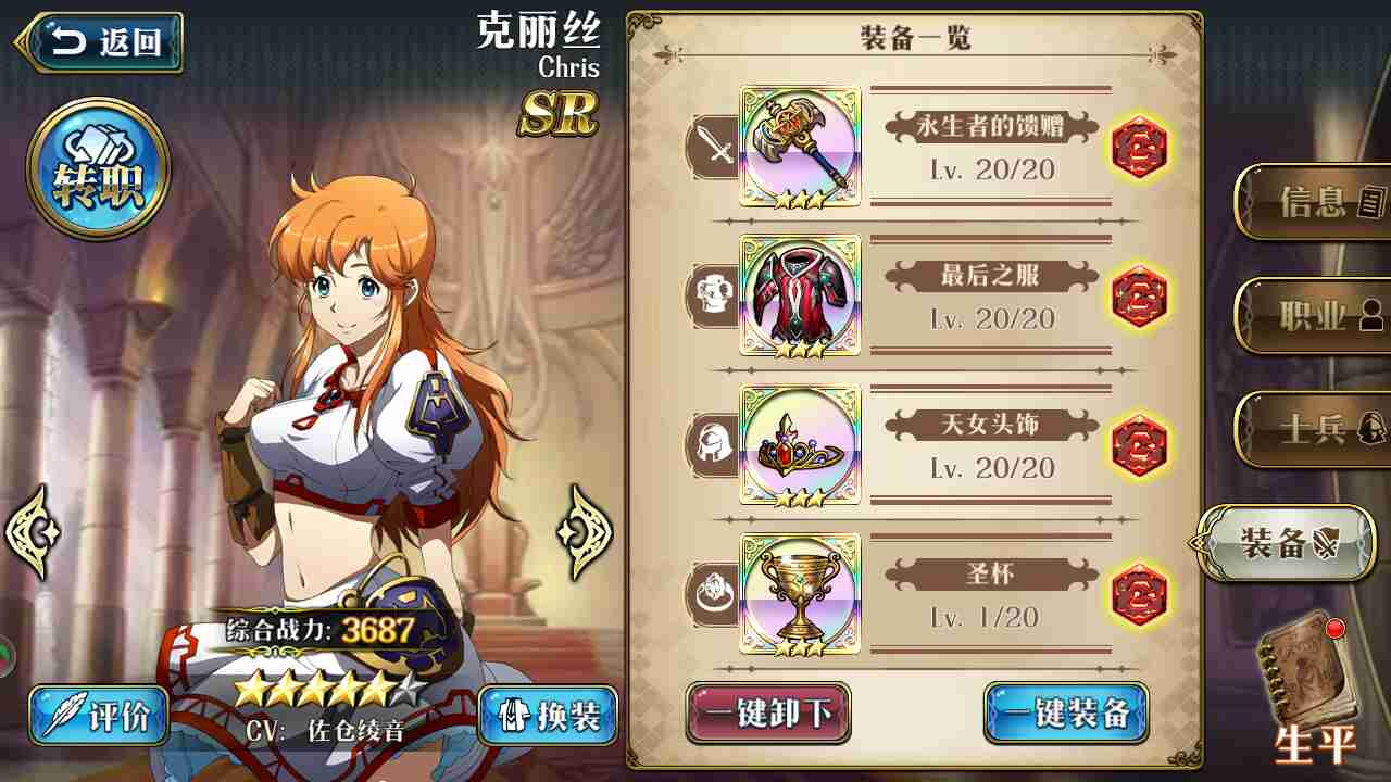 60级几个月了,抽卡过千,放弃光辉雪莉25的原因竟然h是因为一个sr🙃。没辣鸡海恩,开不了雪莉,25,莉亚娜羁绊。这些装备一点用都没有。平时常驻波波,拉娜,玲,元帅,利昂,莉亚娜。