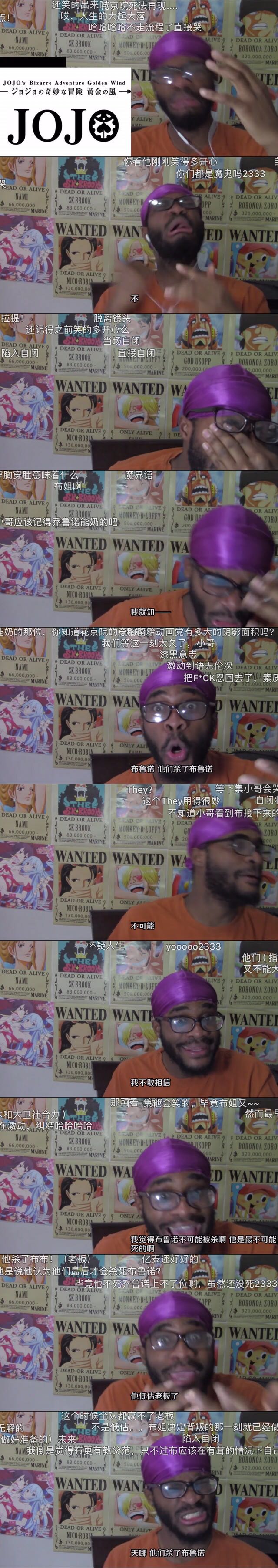 作为一个动画党且坚定不移的jo厨 买了各种jojo周边但却坚持不看漫画 每次看评论区前会让人先把剧透的清理掉 最重要的是特别特别真实 列车站米斯达中枪后人愣在那儿几秒钟只有嘴唇在颤抖 反正在我心里第一吴克 第二黑人小哥 第三勇者