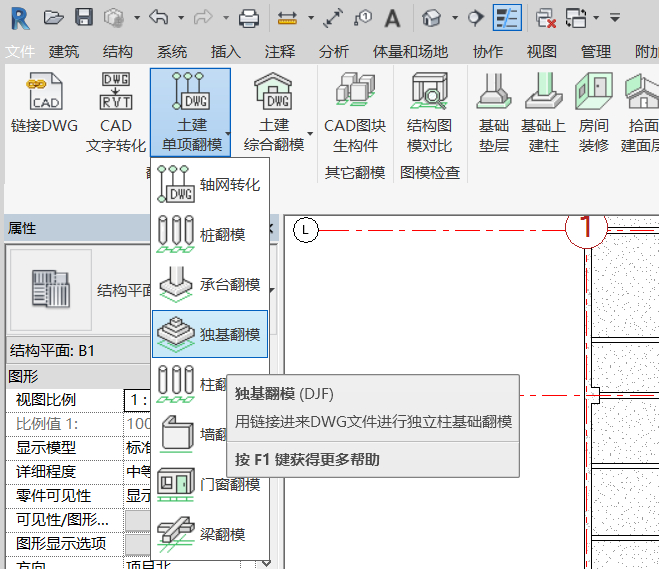 5.梁柱翻模。选取图纸基点(例如1-A,根据实际情况可变化),按照同导入轴网步骤一样导入柱图,梁图,进行翻模。