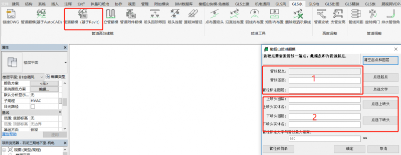 12.机电专业翻模。按翻模要求进行链接CAD图层选取,设置完成后点击“生成”即可。水管翻模同理(消防管道翻模需点击喷头,除消防系统外不需点击,跳过喷头部分“2”即可)