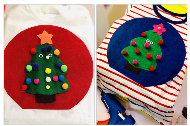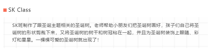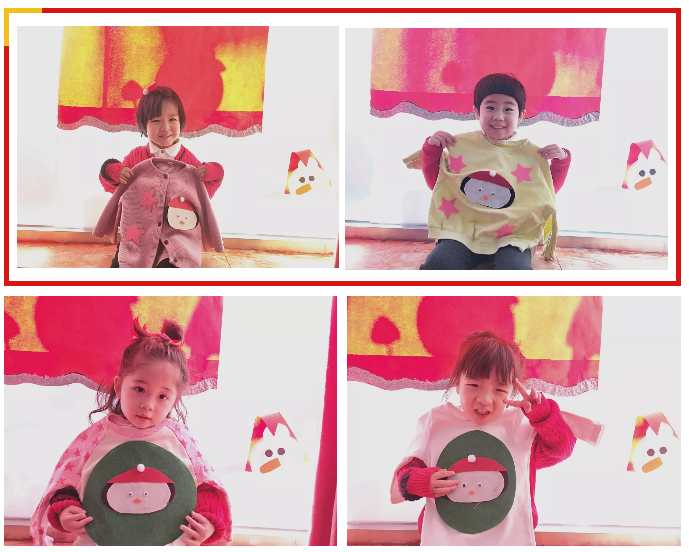 JK班制作了圣诞树和小企鹅装饰。孩子们一起设计了圣诞树和小企鹅的样子,老师们帮孩子们剪好,然后孩子们自己决定选择哪一种来装饰自己的衣服。有的孩子为自己的圣诞树装饰上了花边,有的孩子为自己的小企鹅粘上了眼睛和嘴巴......